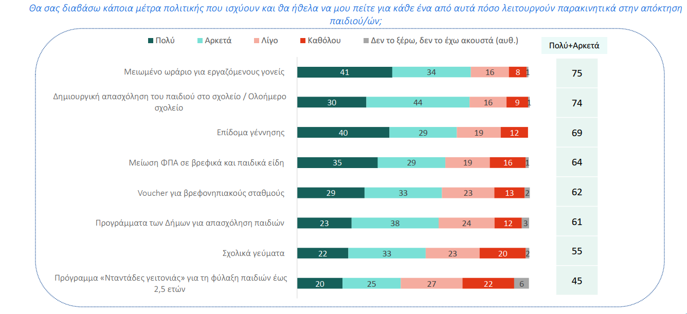 Στην ίδια έρευνα, μαθαίνουμε ότι από τα ισχύοντα μέτρα κρατικής στήριξης οι συμμετέχοντες προκρίνουν κυρίως το μειωμένο ωράριο για εργαζόμενους γονείς, το επίδομα γέννησης και η μείωση του ΦΠΑ σε παιδικά/βρεφικά είδη.