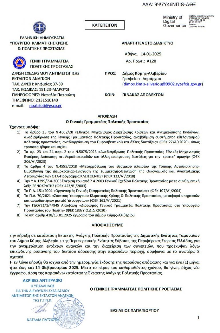 Ο Δήμος Κύμης-Αλιβερίου παραμένει σε διαρκή επικοινωνία με τις αρμόδιες υπηρεσίες για τον συντονισμό των απαραίτητων ενεργειών. «Καλούμε τους πολίτες να επιδείξουν ψυχραιμία, συνεργασία και κατανόηση, μέχρι να επιλυθεί πλήρως το ζήτημα και να αποκατασταθεί η κανονικότητα» αναφέρει ο Δήμος σε σχετική του ενημέρωση.