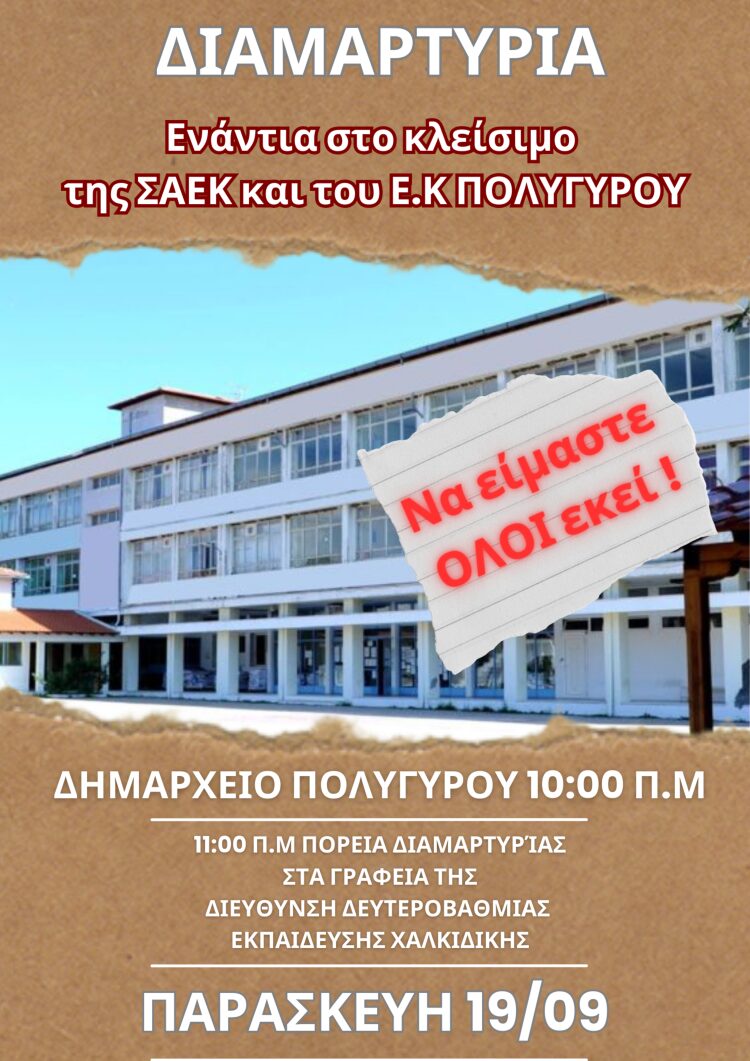 Διαδήλωση διαμαρτυρίας θα πραγματοποιηθεί την Παρασκευή 19 Σεπτεμβρίου 2025, στις 11:00π.μ., από το Δημαρχείο Πολυγύρου προς τη Διεύθυνση Δευτεροβάθμιας Εκπαίδευσης Χαλκιδικής, με αφορμή το λουκέτο στη ΣΑΕΚ Πολυγύρου, μετά από απόφαση του Υπουργείου Παιδείας, χωρίς καμία ενημέρωση! Με τη συγκεκριμένη απόφαση δεκάδες σπουδαστές μένουν εκτεθειμένοι, ενώ καλούνται να μεταβούν στη ΣΑΕΚ Μουδανιών, με την οποία συγχωνεύτηκε. Ταυτόχρονα, εξαιτίας αυτής της συγχώνευσης, αναστέλλεται η λειτουργία του Εργαστηριακού Κέντρου Πολυγύρου, που έχει διαπίστευση ERASMUS+ και απορροφά επιχορηγήσεις από Ευρωπαϊκά κονδύλια, ύψους 140.000 ευρώ ετησίως. Παράλληλα το κλείσιμο της ΣΑΕΚ και η αναστολή λειτουργίας του Ε.Κ. επηρεάζει αρνητικά τη λειτουργία του ΕΠΑΛ Πολυγύρου, καθώς χρησιμοποιούσε τα εργαστήρια, που ήταν εξοπλισμένα με υπολογιστές, προτζέκτορες, ρομποτικά συστήματα, σύγχρονα όργανα μετρήσεων και υποδομές. Ο Δήμαρχος Πολυγύρου, Γιώργος Εμμανουήλ, έχει στείλει ήδη δύο επιστολές στο Υπουργείο Παιδείας, Θρησκευμάτων και Αθλητισμού και συγκεκριμένα στον αρμόδιο Υφυπουργό, Κωνσταντίνο Βλάση. Η πρώτη επιστολή εστάλη στις 16/5/2025 ζητώντας από τον Υφυπουργό να επανεξετάσει την υπ’ αριθμ. Κ5/52214 απόφαση με θέμα: «Συγχώνευση Σχολών Ανώτερης Επαγγελματικής Κατάρτισης (Σ.Α.Ε.Κ.) αρμοδιότητας Υπουργείου Παιδείας, Θρησκευμάτων και Αθλητισμού», και την υπ’ αριθμ. πρωτ. Κ5/52222 απόφαση με θέμα: «Λειτουργία παραρτημάτων και εκτός έδρας τμημάτων των Σ.Α.Ε.Κ. αρμοδιότητας Υπουργείου Παιδείας, Θρησκευμάτων και Αθλητισμού». Δύο μήνες μετά στις 24/7/2025, ο Δήμαρχος Πολυγύρου επανήλθε με νέα επιστολή, ζητώντας να επανεξεταστεί άμεσα η απόφαση Κ5/52222 και να επιτραπεί στη Σ.Α.Ε.Κ. Πολυγύρου να λειτουργήσει έστω ως Παράρτημα της Σ.Α.Ε.Κ. Νέων Μουδανιών από την 01 Σεπτέμβρη 2025, ώστε να μπορέσουν οι σπουδαστές να ολοκληρώσουν τη φοίτησή τους. Καμία από τις δύο επιστολές δεν έχει απαντηθεί μέχρι σήμερα. Μάλιστα στο περιθώριο της ενημέρωσης για το Κυβερνητικό Έργο στις 28/8/2025, ο κ. Εμμανουήλ, ζήτησε από την Υπουργό Παιδείας, Σοφία Ζαχαράκη, να ξαναδεί το θέμα και τον διαβεβαίωσε ότι ο Υφυπουργός θα επικοινωνούσε τηλεφωνικά μαζί του. Ωστόσο το τηλεφώνημα δε έγινε ποτέ! «Είμαστε δίπλα σε μαθητές, γονείς και καθηγητές. Ο αγώνας μας είναι συλλογικός. Το κλείσιμο της Σ.Α.Ε.Κ. Πολυγύρου και η αναστολή λειτουργίας του Εργαστηριακού Κέντρου, αποτελούν απαράδεκτη υποβάθμιση της δημόσιας επαγγελματικής εκπαίδευσης. Απαιτούμε από την Πολιτεία να αναλάβει άμεσα τις ευθύνες της: να διασφαλίσει τη συνέχιση της σχολής, έστω ως Παράρτημα, ώστε οι σπουδαστές, πολλοί από τους οποίους προέρχονται από την ευρύτερη ενδοχώρα της Χαλκιδικής, να ολοκληρώσουν απρόσκοπτα τις σπουδές τους. Η μετακίνησή τους προς και από τα Ν. Μουδανιά θα καταστεί δύσκολη, χρονοβόρα και δαπανηρή, γεγονός που πιθανώς θα οδηγήσει σε μείωση των εγγραφών, κάτι που σίγουρα δεν επιθυμούμε, εφόσον επιδιώκουμε να έχουμε όσο το δυνατό περισσότερους μορφωμένους και καταρτισμένους νέους, οι οποίοι θα αποτελέσουν τους πρωταγωνιστές του μέλλοντος στη χώρα μας. Η Επαγγελματική Εκπαίδευση στον Πολύγυρο δε θα επιτρέψουμε να απαξιωθεί· η νεολαία μας δεν μπορεί στερηθεί το δικαίωμα στη μόρφωση και στην επαγγελματική προοπτική που της αξίζει», τονίζει ο Δήμαρχος Πολυγύρου, Γιώργος Εμμανουήλ.