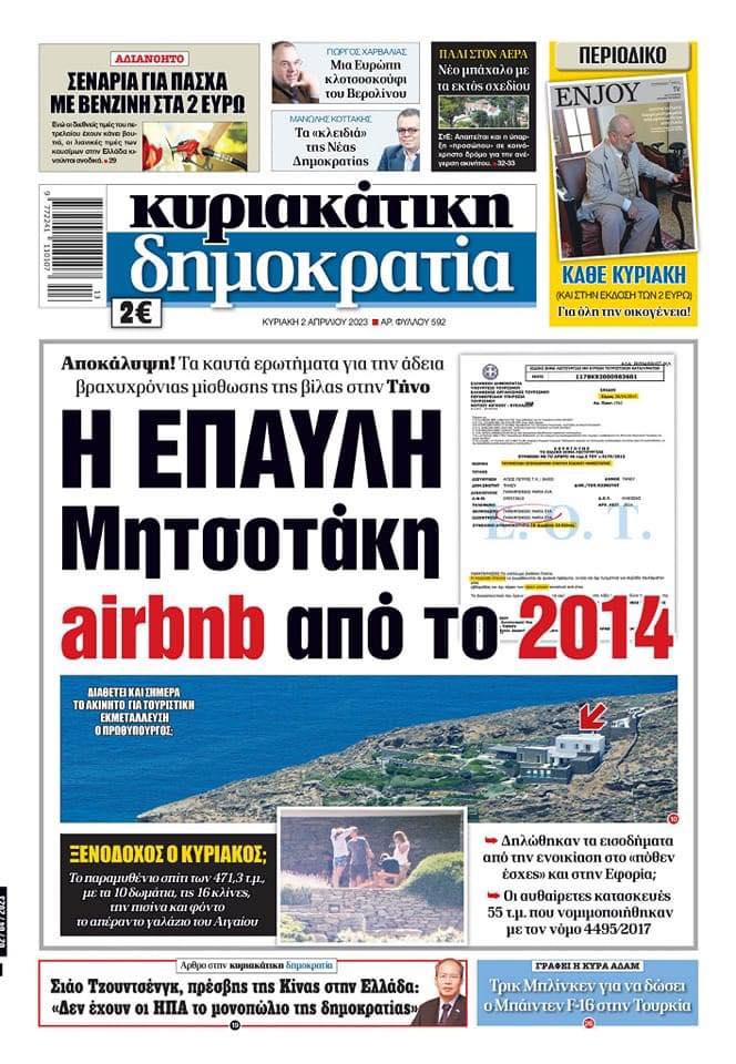 Με τίτλο «Η ΕΠΑΥΛΗ Μητσοτάκη airbnb από το 2014», αναρωτιέται αν «διαθέτει και σήμερα το ακίνητο για τουριστική εκμετάλλευση ο πρωθυπουργός», κάνοντας λόγο για «Το παραμυθένιο σπίτι των 471,3 τ.μ., με τα 10 δωμάτια, τις 16 κλίνες, την πισίνα και φόντο το γαλάζιο του Αιγαίου».