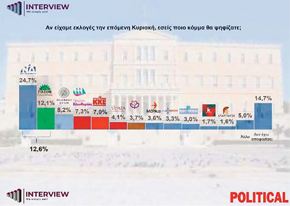 Δημοσκόπηση Interview: Στο 15,9% η διαφορά ΝΔ με ΠΑΣΟΚ – Τέταρτη η Πλεύση Ελευθερίας