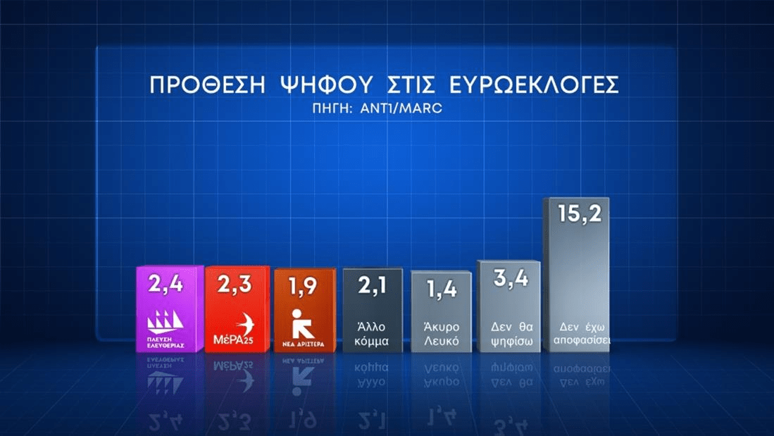 Στο δεύτερο μέρος της δημοσκόπησης της Marc, που έγινε για λογαριασμό του ΑΝΤ1, στην πρόθεση ψήφου στις Ευρωεκλογές λαμβάνουν: 29,7% η Νέα Δημοκρατία, δεύτερο κόμμα είναι το ΠΑΣΟΚ με 13,4%, τρίτος ο ΣΥΡΙΖΑ με μόλις 10,1% ο ΣΥΡΙΖΑ και έπονται ΚΚΕ με 7,5%, Ελληνική Λύση με 5,6% και ακολουθούν Σπαρτιάτες και ΝΙΚΗ με 2,5%, Πλεύση Ελευθερίας με 2,4%, ΜέΡΑ25 με 2,3%, Νέα Αριστερά με 1,9%, άλλο κόμμα επιλέγει το 2,1%, ενώ άκυρο/λευκό και αποχή επιλέγουν συνολικά 4,8% των ερωτηθέντων, ενώ αναποφάσιστο είναι το 15,2%.