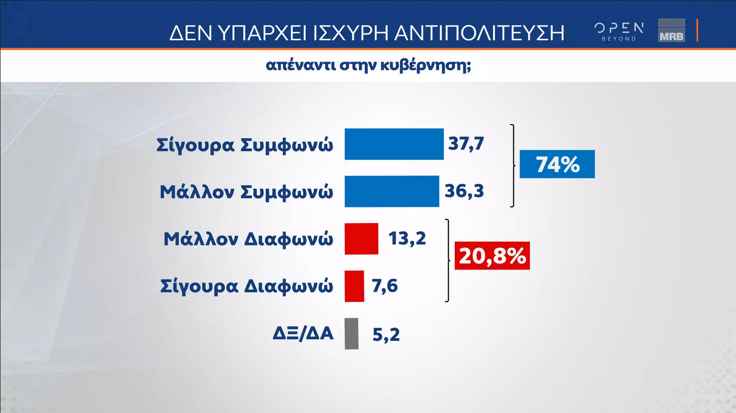- Απαντώντας σε σχετικό ερώτημα, οι πολίτες λένε σε ποσοστό 74% πως δεν υπάρχει αντιπολίτευση στην κυβέρνηση Μητσοτάκη, ενώ το 20,8% απαντά πως υπάρχει αντιπολίτευση.