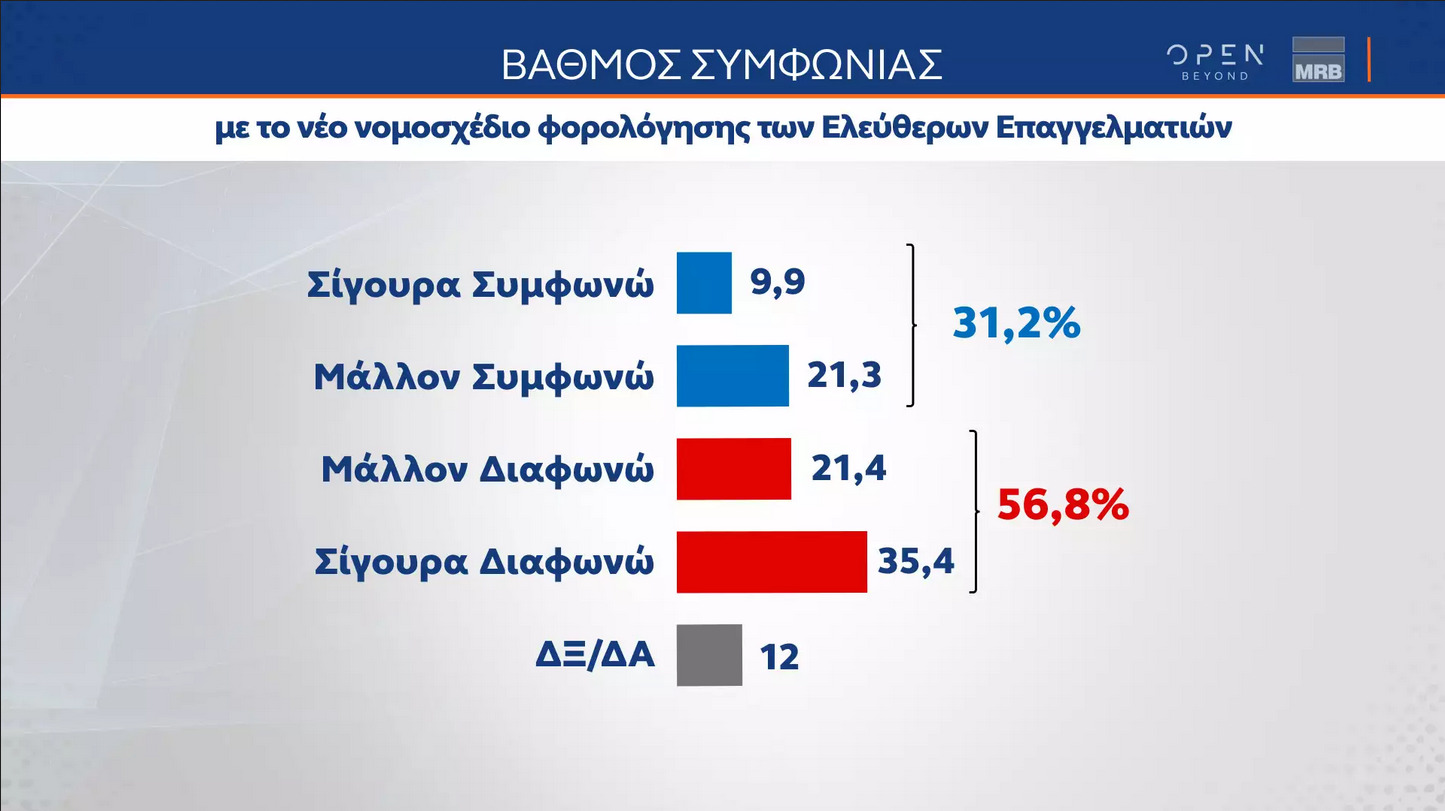 - Το 56,8% διαφωνεί με το νέο φορολογικό νομοσχέδιο, ενώ το 31,2% συμφωνεί με τις διατάξεις του νόμου που ψηφίστηκε πρόσφατα και φέρνει αλλαγές κυρίως στους ελεύθερους επαγγελματίες.
