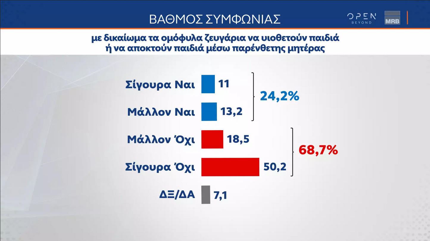 - Απαντώντας σε ερώτηση για το εάν πρέπει τα ομόφυλα ζευγάρια να μπορούν να υιοθετούν παιδιά ή να αποκτούν παιδιά μέσω παρένθετης μητέρας, το 68,7% εκφράζει τη διαφωνία του, ενώ το 24,2% συμφωνεί.