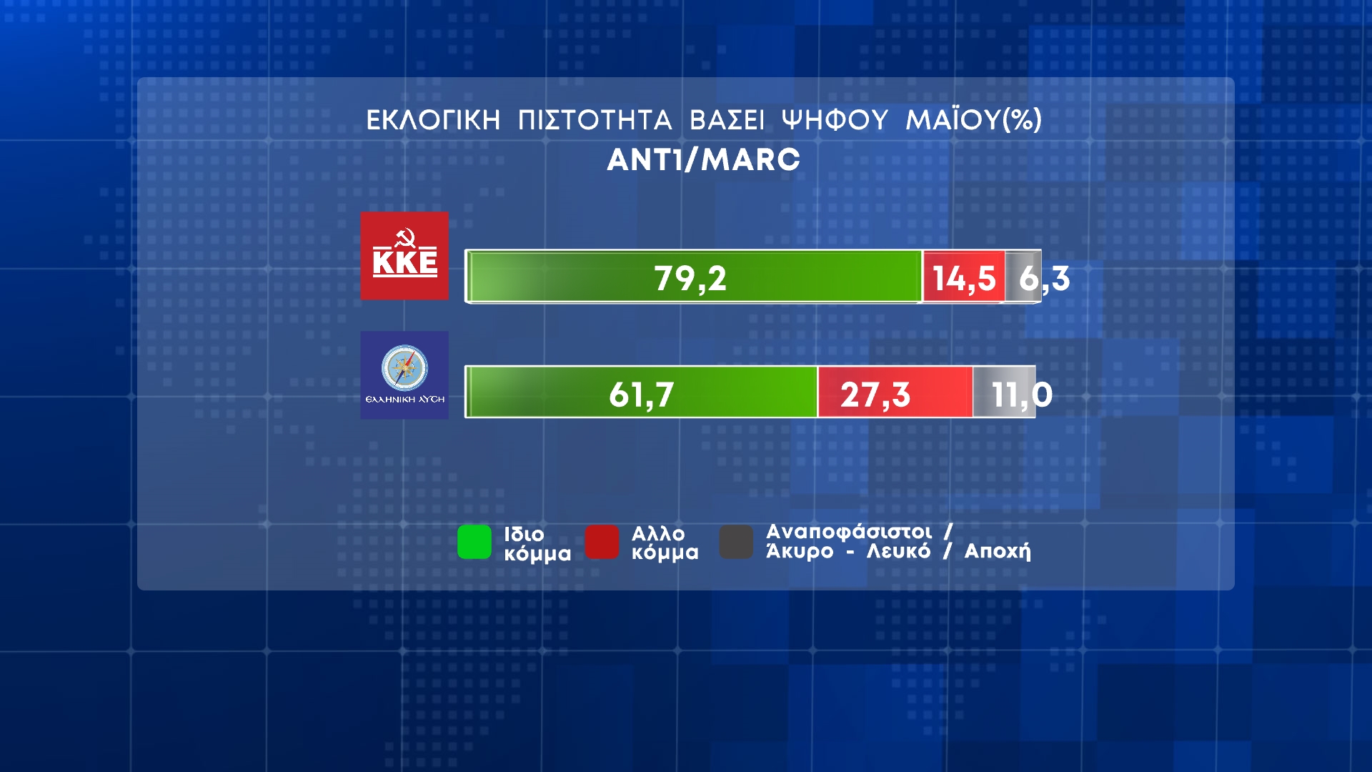 Στην πρόθεση ψήφου, τα ποσοστά που συγκεντρώνουν τα κόμματα, σύμφωνα με την δημοσκόπηση της Marc για τον ΑΝΤ1, συγκεντρώνουν: