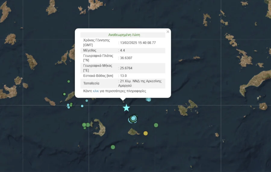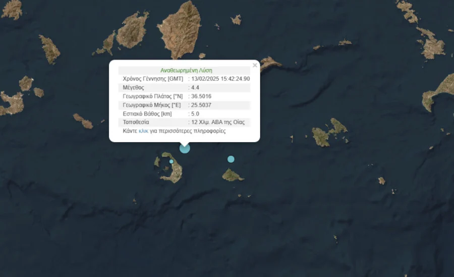 Δύο σεισμοί σε διάστημα μικρότερο των 3 λεπτών σημειώθηκε το απόγευμα της Πέμπτης (13/2) στη θαλάσσια περιοχή μεταξύ Αμοργού και Σαντορίνης.