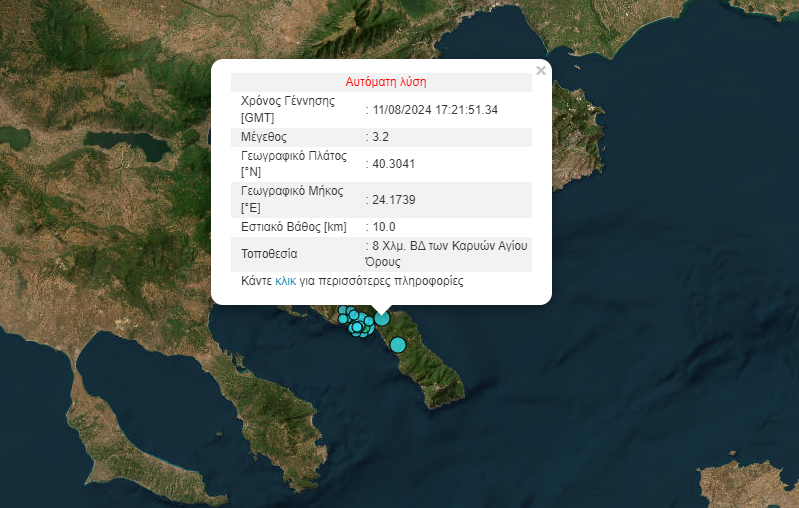 Σεισμός μεγέθους 3,5 βαθμών της Κλίμακας Ρίχτερ σημειώθηκε νωρίς το βράδυ της Κυριακής (11/8) στο Άγιο Όρος Χαλκιδικής.