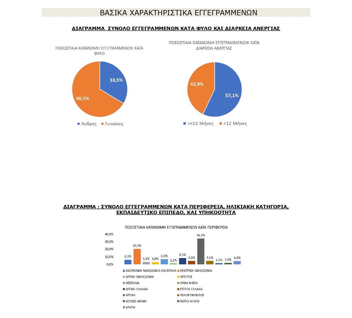 Μεταξύ των Περιφερειών της Χώρας η Περιφέρεια Αττικής και η Περιφέρεια Κεντρικής Μακεδονίας καταγράφουν τον μεγαλύτερο αριθμό εγγεγραμμένων ο οποίος ανέρχεται σε 272.849 άτομα (ποσοστό 34,3%) και 161.105 άτομα (ποσοστό 20,3%) αντίστοιχα.