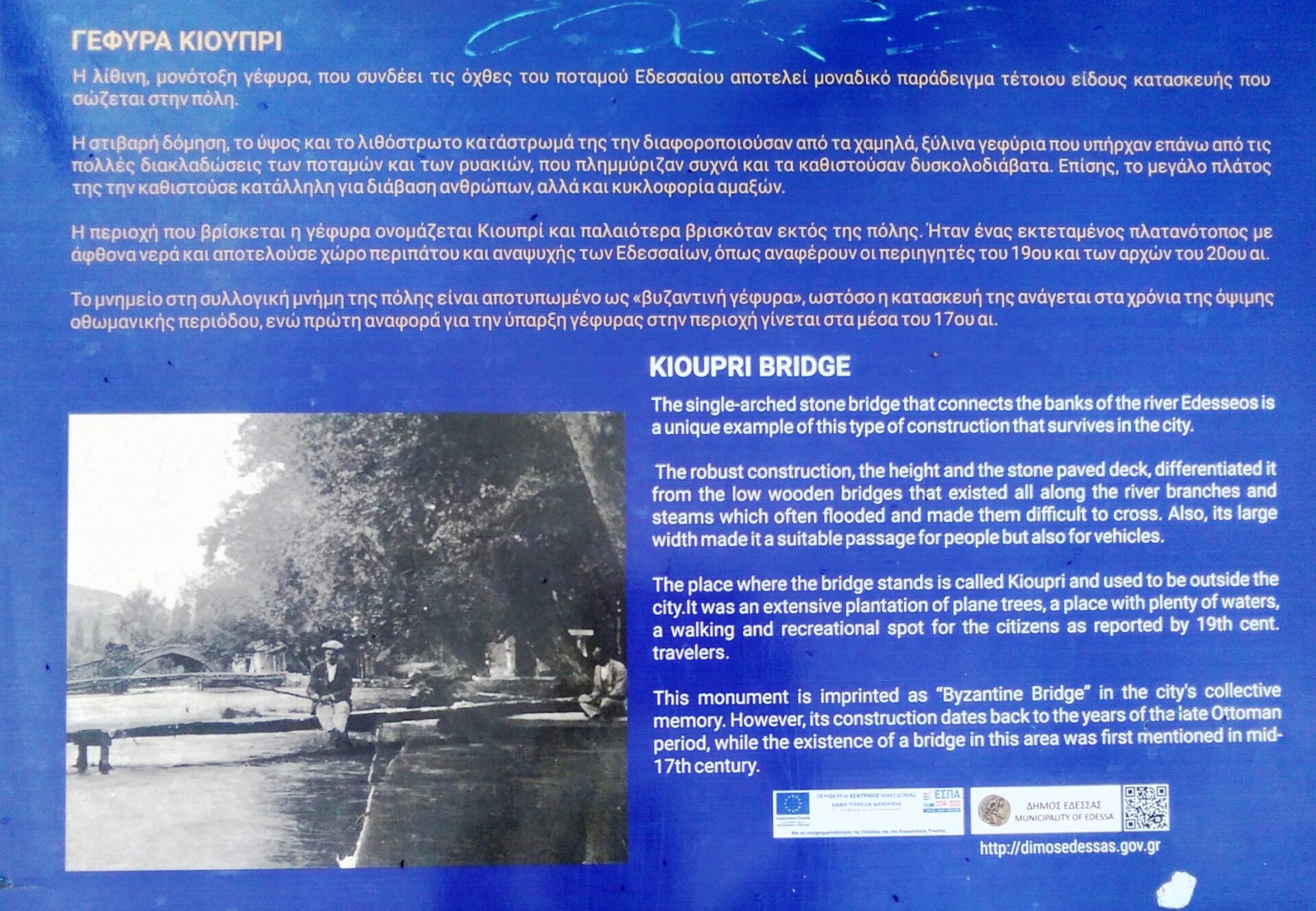 Πρόκειται για την περιοχή Κιουπρί, όπου δεσπόζουν η τοξωτή βυζαντινή Γέφυρα και ένας επιβλητικός αιωνόβιος πλάτανος. Το συγκεκριμένο σημείο της πόλης θεωρείται μετά τους γνωστούς καταρράκτες της Έδεσσας, τοπόσημο αναφοράς και επισκεψιμότητας της πόλης των «νερών και του πράσινου».