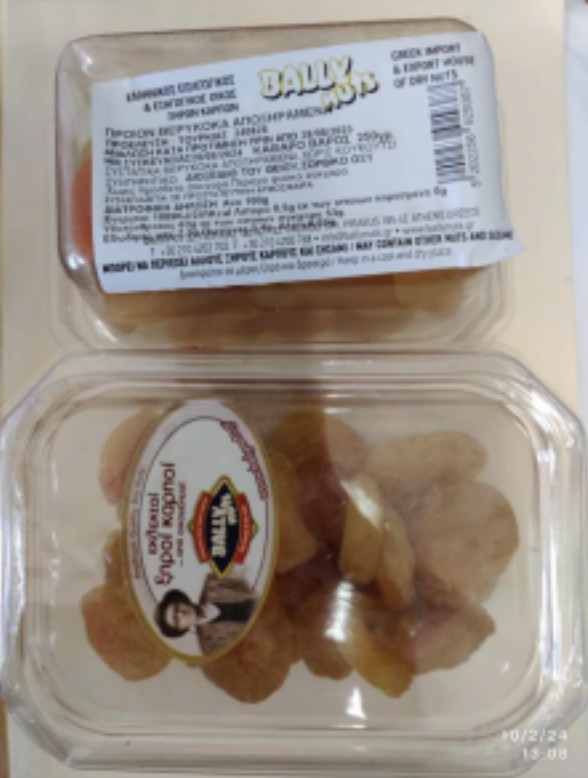 Ο Ενιαίος Φορέας Ελέγχου Τροφίμων (ΕΦΕΤ) και συγκεκριμένα η Περιφερειακή Δ/νση Ανατολικής Μακεδονίας & Θράκης κατά τη διενέργεια ελέγχων στο πλαίσιο του Προγράμματος επισήμου ελέγχου έτους 2024, για τον έλεγχο προσθέτων τροφίμων και αρωματικών ουσιών σε διάφορα είδη τροφίμων, προέβη σε δειγματοληψία τροφίμου με στοιχεία «Εκλεκτοί ξηροί καρποί BALLY NUTS ΒΕΡΥΚΟΚΑ ΑΠΟΞΗΡΑΜΕΝΑ ΠΡΟΕΛΕΥΣΗ: ΤΟΥΡΚΙΑΣ» σε πλαστική κλειστή συσκευασία 250γρ, με ημερομηνία συσκευασίας 28/08/2024 και ανάλωση κατά προτίμηση πριν από: 28/08/2025, που συσκευάζεται από την επιχείρηση, BALLY NUTS Κ.Μ. ΜΠΑΛΑΜΟΥΤΣΟΣ Ι.Κ.Ε., με έδρα Φαλήρου 32 ΤΚ 185 42 στον Πειραιά.