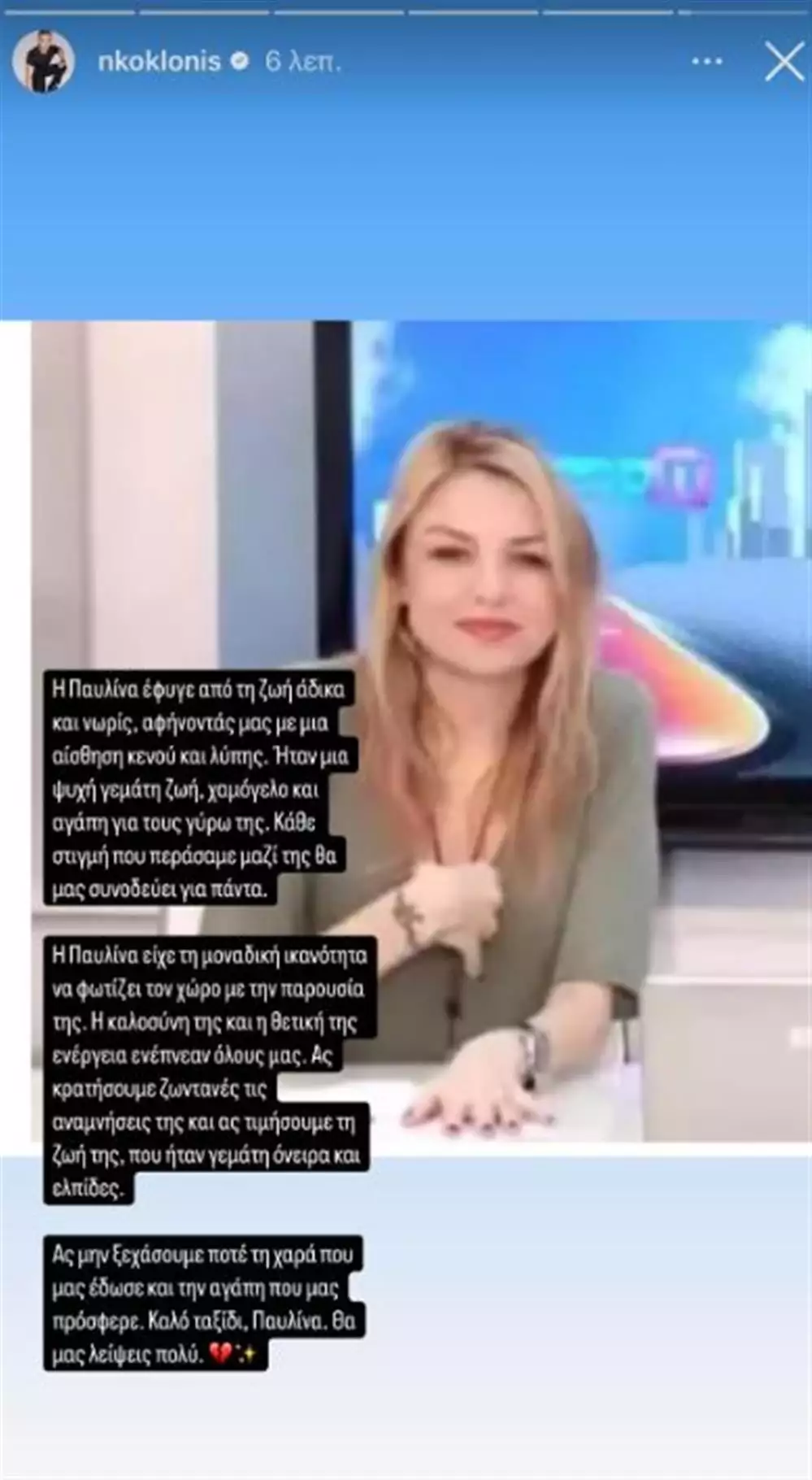 Και ο Νίκος Κοκλώνης αποχαιρέτησε τη δημοσιογράφο με μία συγκινητική ανάρτηση: «Η Παυλίνα έφυγε από τη ζωή άδικα και νωρίς αφήνοντάς μας με μια αίσθηση κενού και λύπης. Ήταν μια ψυχή γεμάτη ζωή, χαμόγελο και αγάπη για τους γύρω της. Κάθε στιγμή που περάσαμε μαζί της θα μας συνοδεύει για πάντα.
