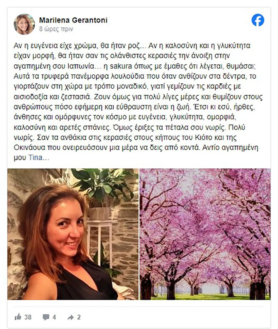 Συνάδελφοί της την αποχαιρετούν με αναρτήσεις στα social media. «Αν η ευγένεια είχε χρώμα, θα ήταν ροζ… Αν η καλοσύνη και η γλυκύτητα είχαν μορφή, θα ήταν σαν τις ολάνθιστες κερασιές την άνοιξη στην αγαπημένη σου Ιαπωνία […] Όμως έριξες τα πέταλα σου νωρίς. Πολύ νωρίς. Σαν τα ανθάκια στις κερασιές στους κήπους του Κιότο και της Οκινάουα που ονειρευόσουν μια μέρα να δεις από κοντά» έγραψε η Μαριλένα Γεραντώνη.