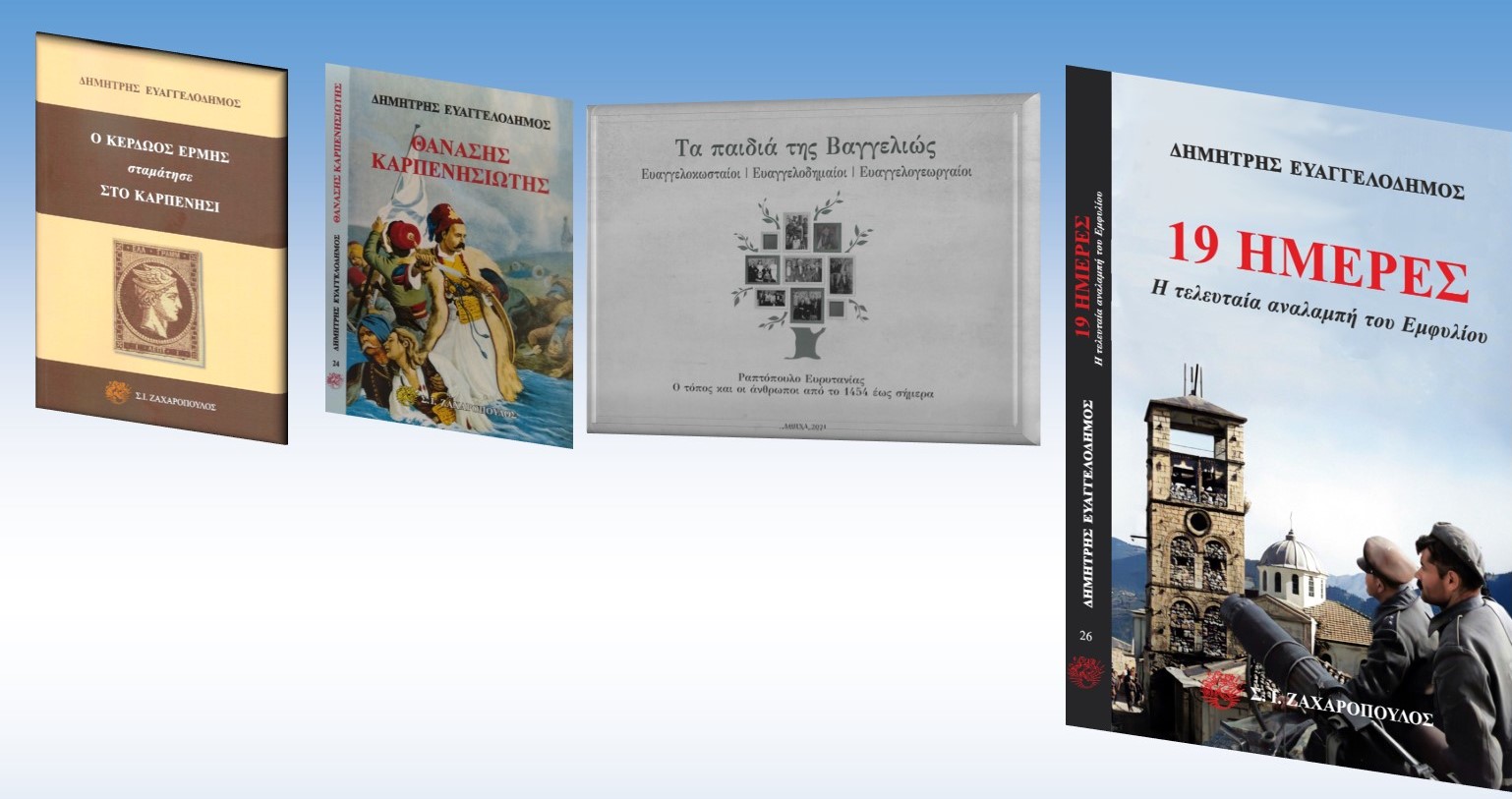 «19 Ημέρες – Η τελευταία αναλαμπή του Εμφυλίου» «Τα παιδιά της Βαγγελιώς» «Θανάσης Καρπενησιώτης» «Ο Κερδώος Ερμής σταμάτησε στο Καρπενήσι» Η κηδεία του Δημήτρη Ευαγγελοδήμου θα γίνει την Δευτέρα 30 Οκτωβρίου, στις 11 το πρωί, στον Ιερό Ναό Μεταμόρφωσης Σωτήρος (Βόλου 1), στο Χαλάνδρι Αττικής.