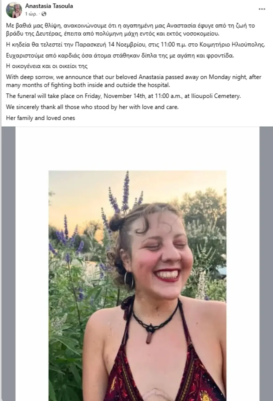 Η κηδεία θα τελεστεί την Παρασκευή 14 Νοεμβρίου, στις 11:00 π.μ. στο Κοιμητήριο Ηλιούπολης. Ευχαριστούμε από καρδιάς όσα άτομα στάθηκαν δίπλα της με αγάπη και φροντίδα», ανακοίνωσε η οικογένεια της Αναστασίας στα social media.