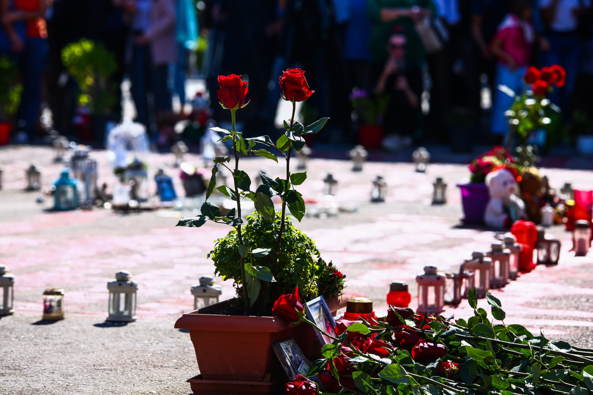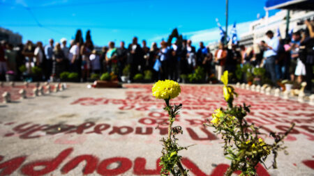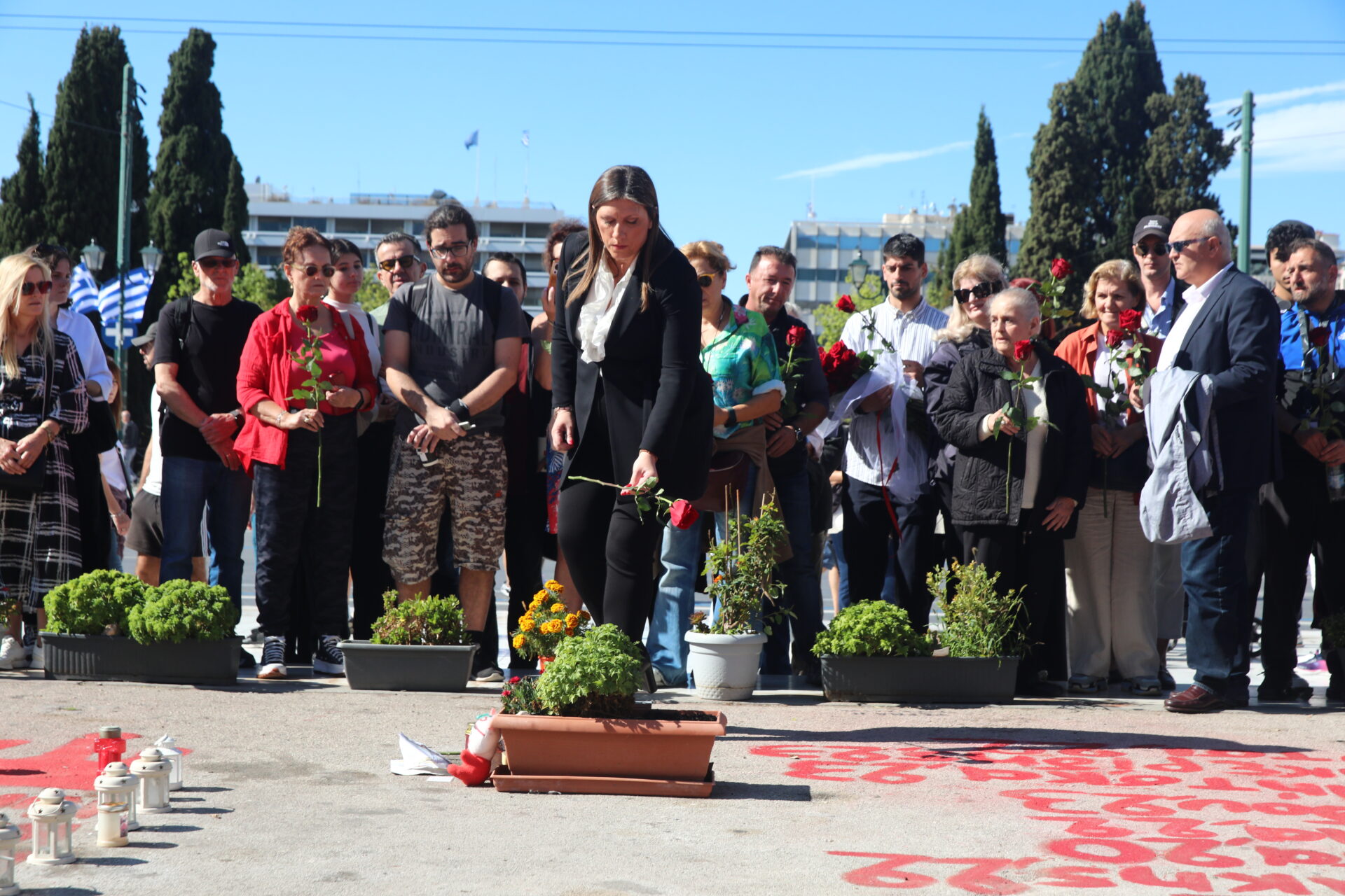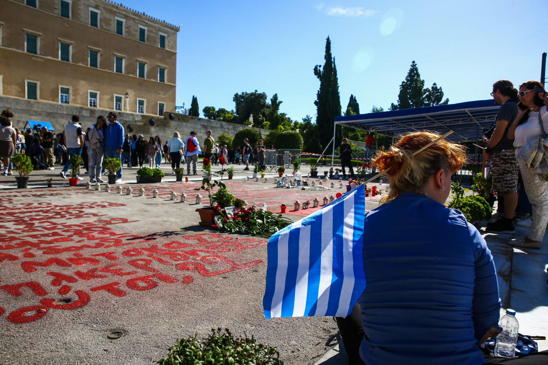 ΕΙΚΟΝΕΣ: Λουλούδια στη μνήμη των θυμάτων των Τεμπών στο Σύνταγμα