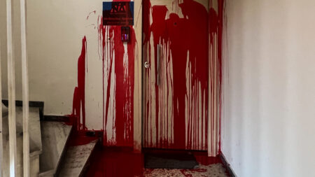 Σύμφωνα με το tempo24 οι άγνωστοι προκάλεσαν φθορές πετώντας μπογιές στην είσοδο.