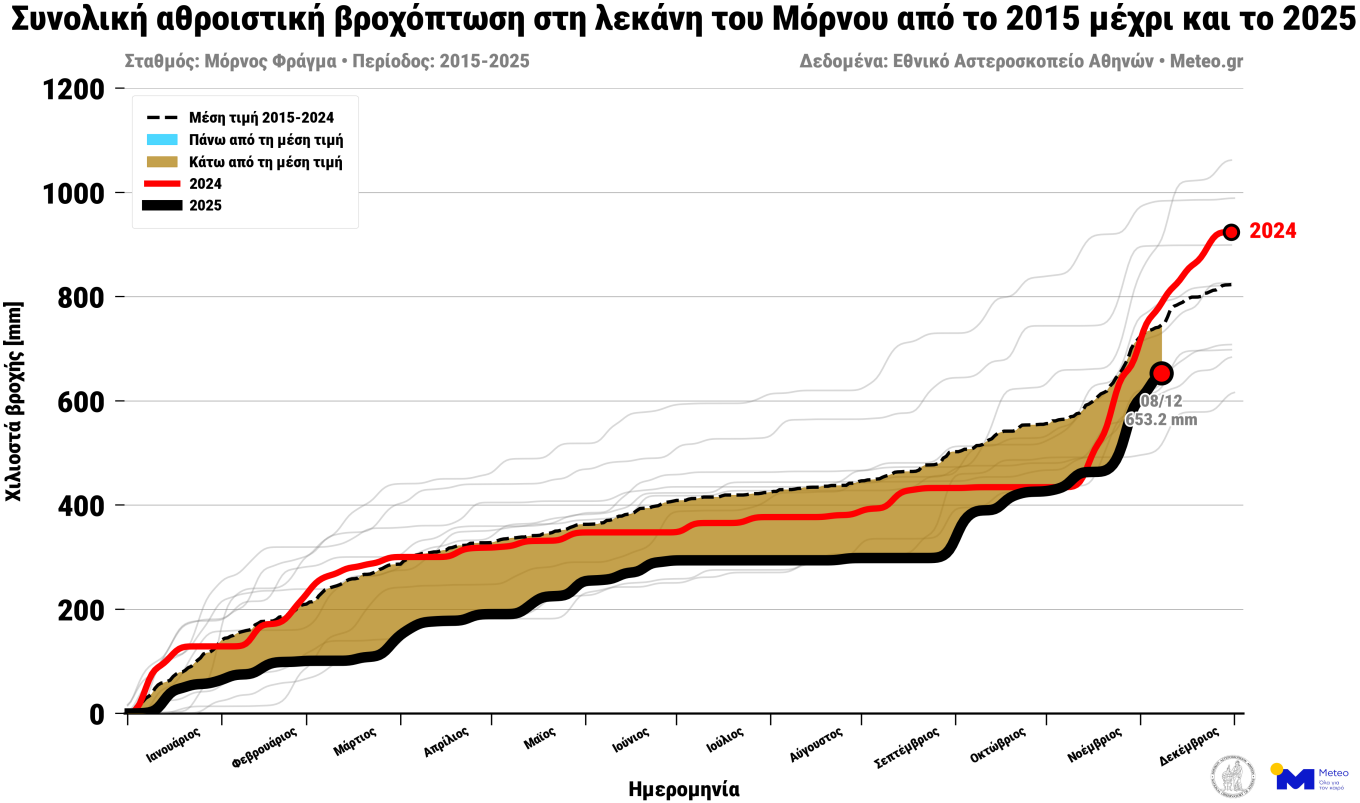 Στο Φράγμα Μόρνου έχουν καταγραφεί μέχρι στιγμής 653 χιλιοστά βροχής. Η μέση τιμή των προηγούμενων δέκα ετών για το ίδιο διάστημα υπολογίζεται περίπου στα 800 χιλιοστά.