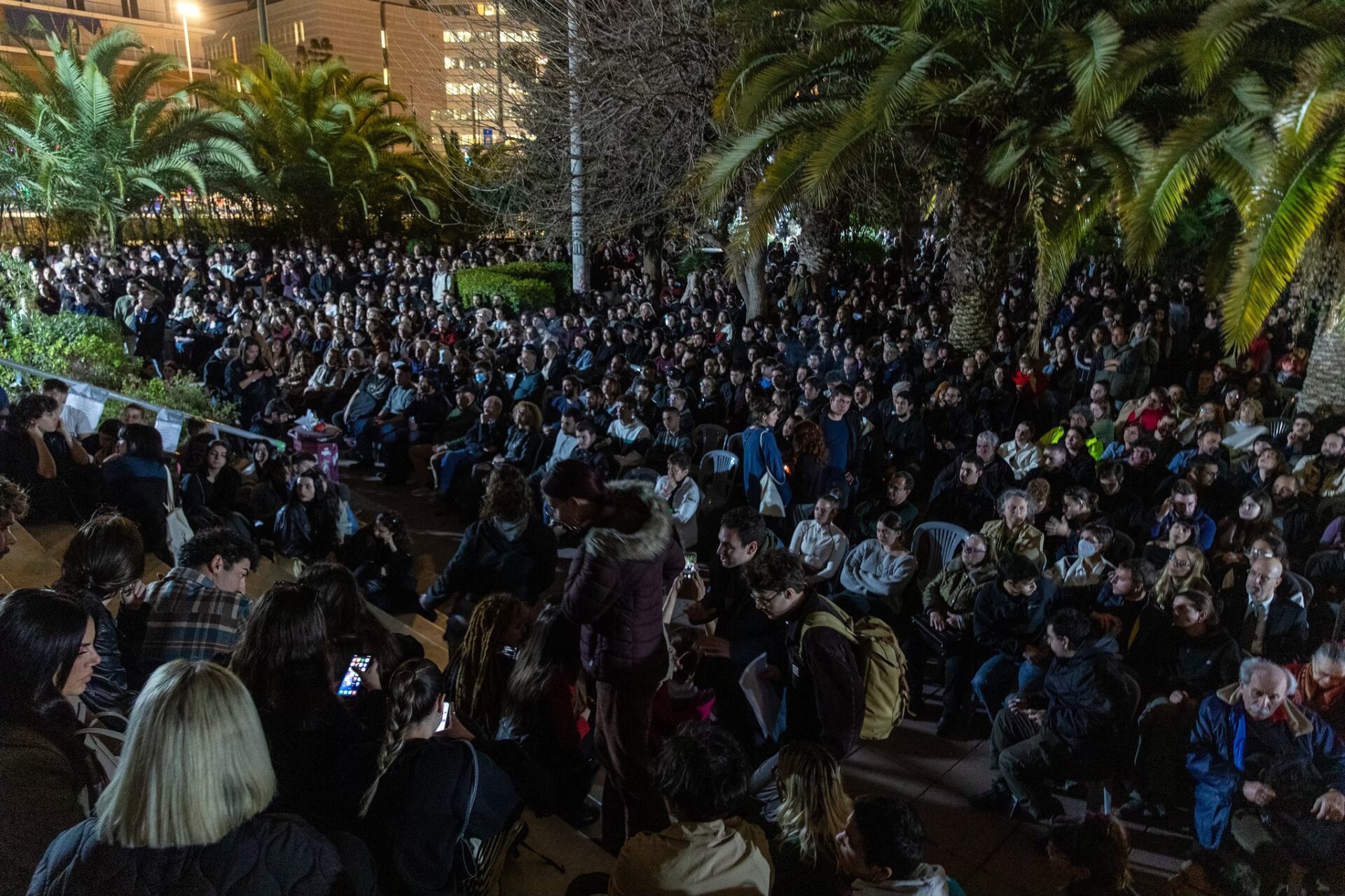Συνθήματα, χειροκροτήματα και πολλά δάκρυα εναλάσσονταν μεταξύ των τοποθετήσεων των ομιλητών. Το παρόν δεν έδωσε μόνο η Μαρία Καρυστιανού, αλλά και οι Παύλος Ασλανίδης, Ηλίας Παπαγγελής που έχασαν τα παιδιά τους στα Τέμπη, αλλά και οι Θανάσης Καμπαγιάννης, Μάρκος Μπεκρής, Δημήτρης Κουτσιαύτης. Πίσω από τους ομιλητές οι φοιτητές του Παντείου έγραψαν στα ονόματα των 57 νεκρών της τραγωδίας και σε κάθε χαρτί άφησαν από ένα κόκκινο γαρύφαλλο.
