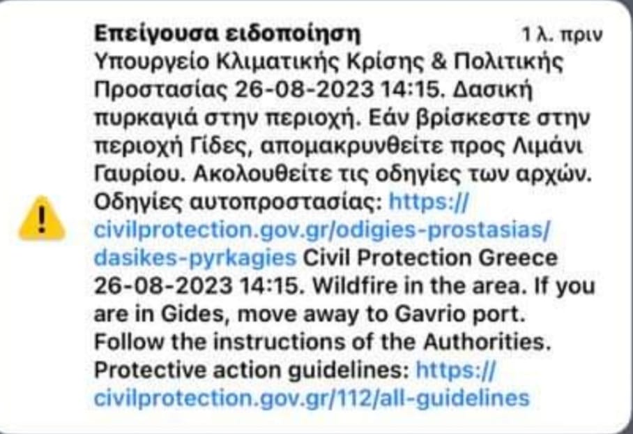 Συγκεκριμένα το μήνυμα αναφέρει: «Εάν βρίσκεστε στην περιοχή Γίδες απομακρυνθείτε προς Λιμάνι Γαυρίου. Δασική πυρκαγιά στην περιοχή σας. Ακολουθείτε τις οδηγίες των Αρχών».