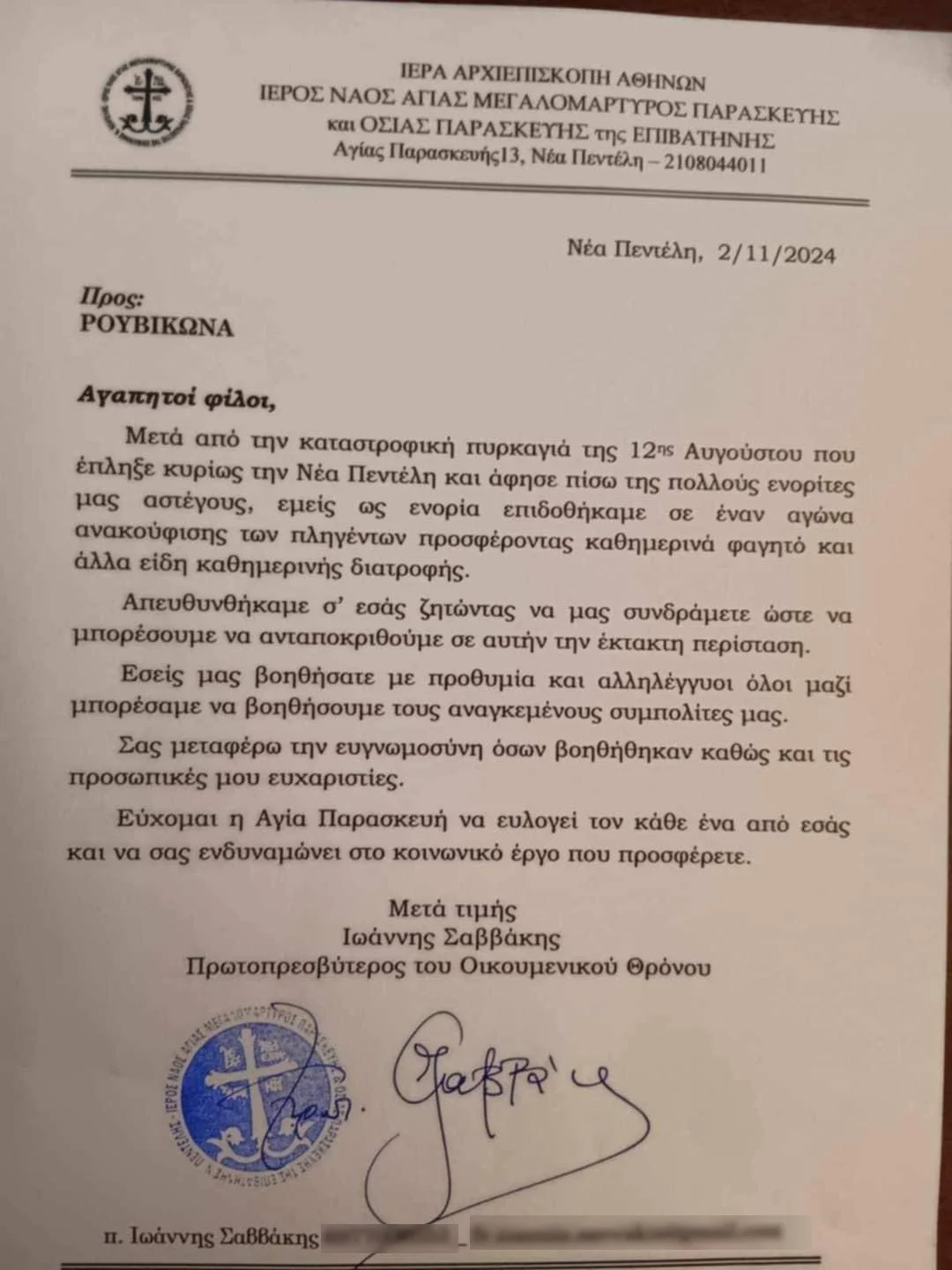 Για λογαριασμό του Ιερού Ναού Αγίας Μεγαλομάρτυρος Παρασκευής και Οσίας Παρασκευής της Επιβατηνής στη Νέα Πεντέλη, ο π.Ι. Σαββάκης λέει «ευχαριστώ» στα μέλη του Ρουβίκωνα.