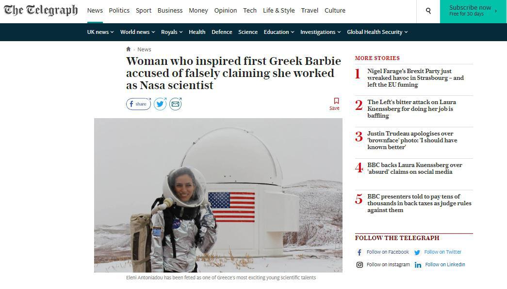 Στο εκτενές της δημοσίευμα η Telegraph αναφέρει μεταξύ άλλων πως αφορμή για την αμφισβήτηση των επιτευγμάτων της Ελένης Αντωνιάδου υπήρξε βράβευσή της από την υπουργό Παιδείας Νίκη Κεραμέως και η ανάρτηση του καθηγητή Κώστα Μπουγιούκου στο Facebook στην οποία αποδομεί τους ισχυρισμούς για την Ελένη Αντωνιάδου, καταλήγοντας πως «Δεν πληροί καν τα κριτήρια να αποκαλείται επιστήμονας για τους περισσότερους». Παράλληλα, ο κ. Μπουγιούκος ισχυρίζεται ότι η κ. Αντωνιάδου δεν εργάστηκε ποτέ στη NASA, απλά ολοκλήρωσε το Frontier Development Lab της υπηρεσίας, που πρόκειται για ένα εκπαιδευτικό πρόγραμμα οκτώ εβδομάδων.