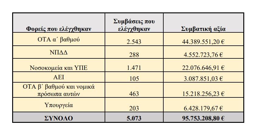 Σημειώνεται ότι συνολικά ελέγχθηκαν 31 ΟΤΑ α΄ βαθμού, 4 ΟΤΑ β΄ βαθμού και 2 νομικά πρόσωπα, 9 νομικά πρόσωπα δημοσίου δικαίου, 7 νοσοκομεία και 2 ΥΠΕ, 3 Ανώτατα Εκπαιδευτικά Ιδρύματα και 6 υπουργεία.
