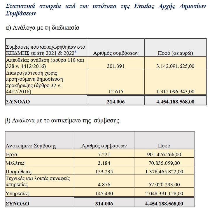 Σύμφωνα με τα στοιχεία, μόνο για τα έτη 2021 – 2022, έγιναν 314.006 συμβάσεις με απευθείας ανάθεση ή με δαπραγμάτευση χωρίς προηγούμενη δημοσίευση προκήρυξης, με το κόστος να ανέρχεται σε σχεδόν 4,5 δισ. ευρώ.