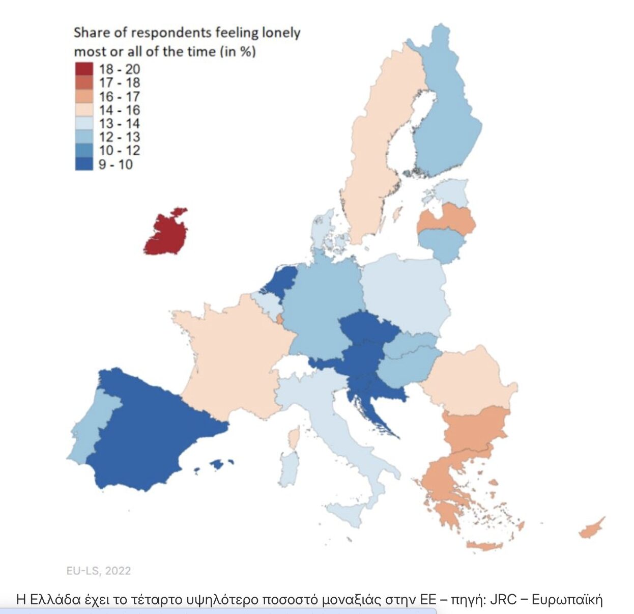 Σύμφωνα με την έρευνα της Κομισιόν, η μοναξιά είναι πιο έντονη στην Ιρλανδία, με δύο στους δέκα να νιώθουν συχνά ή πάντα μοναξιά. Ακολουθούν το Λουξεμβούργο, η Βουλγαρία και στην τέταρτη θέση η Ελλάδα.