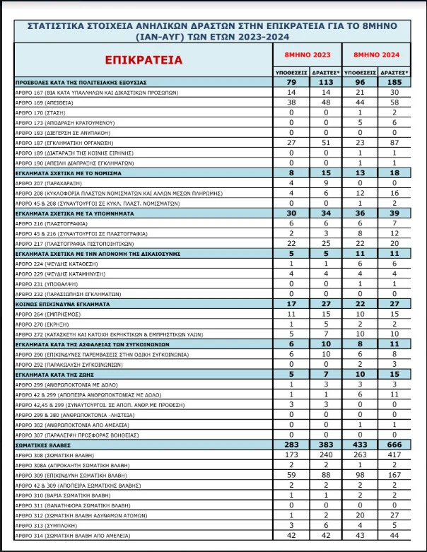 Το πρώτο 8μηνο του 2024 έχει καταγραφεί αύξηση κατά 47% στα περιστατικά εγκληματικότητας ανηλίκων σε σχέση με το αντίστοιχο περσινό διάστημα (4.875 ήταν πέρυσι, 7.180 φέτος), ενώ κατά 45% αυξήθηκαν οι ανήλικοι δράστες (6.157 πέρυσι, 8.978 φέτος). Το αδίκημα της πρόκλησης σωματικών βλαβών αποτελεί για τους αστυνομικούς έναν από τους βασικούς δείκτες για την εξέλιξη της βίας ανηλίκων. Τα στοιχεία δείχνουν εκρηκτική αύξηση στον αριθμό των ανήλικων που κατηγορήθηκαν το 2024. Πιο αναλυτικά, η αύξηση στους δράστες για πρόκληση σωματικών βλαβών άγγιξε το 73% (383 ήταν πέρυσι, 666 φέτος).