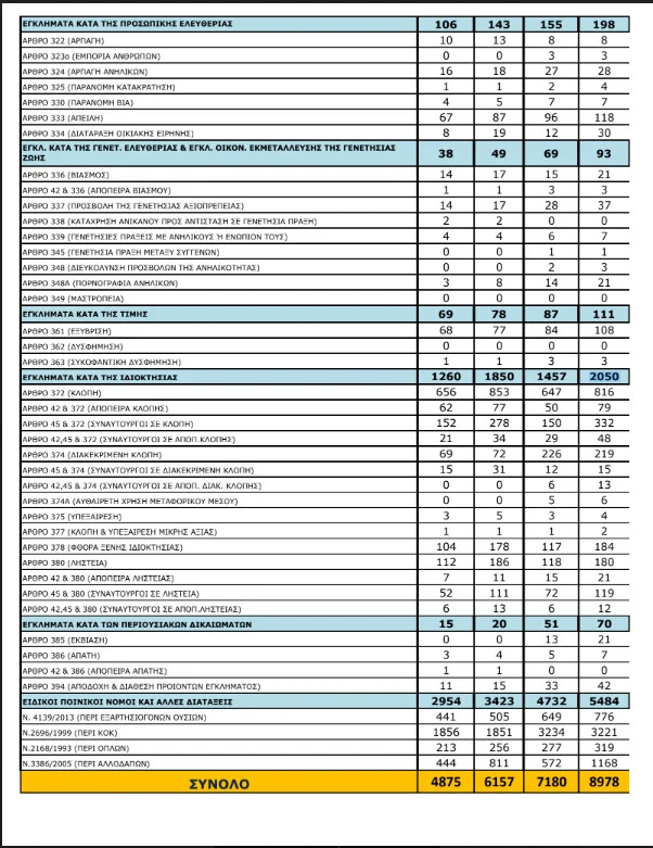 Στα αδικήματα κατά της προσωπικής ελευθερίας (αρπαγή, παράνομη κατακράτηση, παράνομη βία, απειλή, διατάραξη οικιακής ειρήνης) υπήρξε αύξηση κατά 38% στους ανήλικους δράστες (143 πέρυσι, 198 φέτος). Ανησυχητικά είναι τα στοιχεία και στα εγκλήματα κατά της γενετήσιας ελευθερίας (βιασμός, προσβολή της γενετήσιας αξιοπρέπειας, κατάχρηση ανηλίκου σε γενετήσια πράξη, πορνογραφία ανηλίκων). Η αύξηση στον αριθμό των ανήλικων κατηγορουμένων έφτασε το 89% (49 πέρυσι, 93 φέτος). Αίσθηση προκαλεί ότι μέχρι στιγμής το 2024 έχουν κατηγορηθεί για βιασμό συνολικά 21 ανήλικοι και για προσβολή της γενετήσιας αξιοπρέπειας 37.