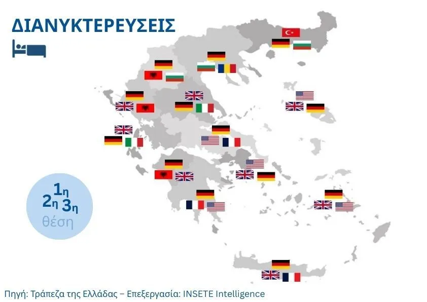 Στη δαπάνη ανά διανυκτέρευση, πρωταγωνίστησε το Νότιο Αιγαίο με 111 € (+5%), ενώ χαμηλότερη καταγράφηκε στην Κεντρική Μακεδονία με 48 €, παρά την οριακή αύξηση +2%.