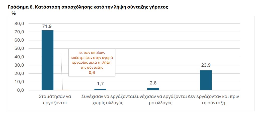 Eπτά στα 10 άτομα ηλικίας 50-74 ετών που λαμβάνουν σύνταξη γήρατος σταμάτησαν να εργάζονται όταν συνταξιοδοτήθηκαν, ποσοστό 71,9%, ενώ ένα σημαντικό ποσοστό, 23,9% δεν εργαζόταν ήδη πριν αρχίσει να λαμβάνει σύνταξη. Μικρά ποσοστά καταγράφονται για τα άτομα που είτε συνέχισαν να εργάζονται χωρίς ή με αλλαγές είτε επέστρεψαν στην αγορά εργασίας κάποια στιγμή αργότερα (1,7%, 2,6% και 0,6%, αντίστοιχα).