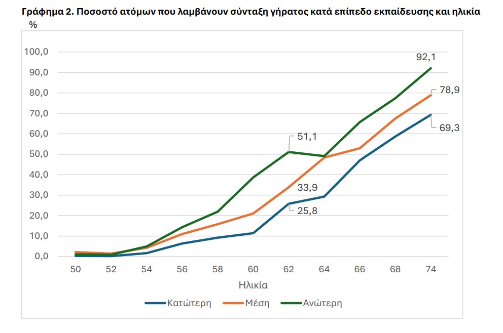 Στην ηλικία των 74 ετών τα ποσοστά συνταξιοδότησης διαμορφώνονται σε 69,3% για τα άτομα κατώτερης εκπαίδευσης, σε 78,9% για τα άτομα μέσης εκπαίδευσης και σε 92,1% για τα άτομα ανώτερης εκπαίδευσης.