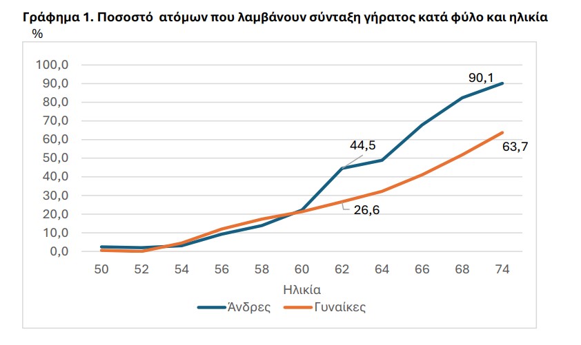 Το ποσοστό των ατόμων ηλικίας 50-74 ετών που λαμβάνουν σύνταξη γήρατος διαφοροποιείται σημαντικά ανάλογα με το φύλο και την ηλικία. Μέχρι την ηλικία των 54 ετών το ποσοστό που λαμβάνει σύνταξη είναι πολύ χαμηλό, κάτω του 5,0%, και αυξάνεται με παρόμοιο τρόπο και για τα δύο φύλα μέχρι την ηλικία των 60 ετών. Μετά τα 60 έτη, το ποσοστό των ατόμων που λαμβάνουν σύνταξη είναι σημαντικά μεγαλύτερο για τους άνδρες έναντι των γυναικών, και στην ηλικία των 74 ετών ανέρχεται στο 90,1% για τους άνδρες και στο 63,7% για τις γυναίκες.