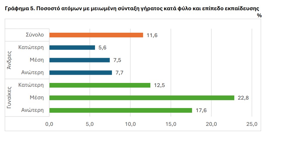 Το ποσοστό των ατόμων ηλικίας 50-74 ετών που δηλώνουν ότι έλαβαν μειωμένη σύνταξη γήρατος ανέρχεται σε 11,6%. Παρατηρούνται σημαντικές διαφορές και ως προς το φύλο και ως προς το εκπαιδευτικό επίπεδο. Το χαμηλότερο ποσοστό των ατόμων παρατηρείται στους άνδρες κατώτερης εκπαίδευσης (5,6%) και το υψηλότερο (22,8%) στις γυναίκες μέσης εκπαίδευσης.