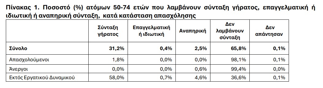 Σύμφωνα με τα αποτελέσματα της έρευνας της ΕΛΣΤΑΤ, το μεγαλύτερο ποσοστό (65,8%) των ατόμων ηλικίας 50-74 ετών δεν λαμβάνει καθόλου σύνταξη (Πίνακας 1). Το ποσοστό των ατόμων που λαμβάνουν εθνική σύνταξη γήρατος εκτιμάται σε 31,2%, το ποσοστό των ατόμων που λαμβάνουν επαγγελματική ή ιδιωτική σύνταξη είναι πολύ χαμηλό, 0,4%, ενώ το ποσοστό των αναπηρικών συντάξεων ανέρχεται σε 2,5%.
