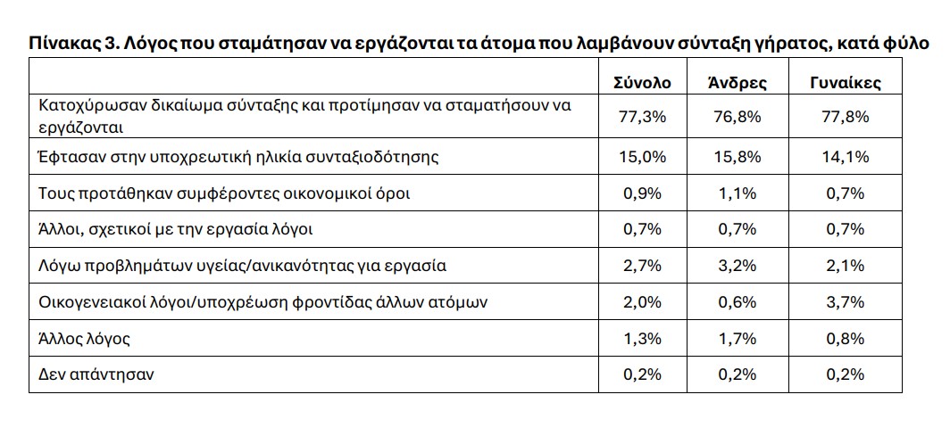 Ως βασικότερος λόγος που τα άτομα ηλικίας 50 έως 74 ετών, τα οποία λαμβάνουν σύνταξη γήρατος, σταμάτησαν να εργάζονται δηλώνεται η προτίμηση να σταματήσουν να εργάζονται από τη στιγμή που κατοχυρώθηκε το δικαίωμα σύνταξης (77,3%), ενώ ένα σημαντικό ποσοστό 15,0% δηλώνει ότι υποχρεώθηκε να σταματήσει λόγω ορίου ηλικίας.