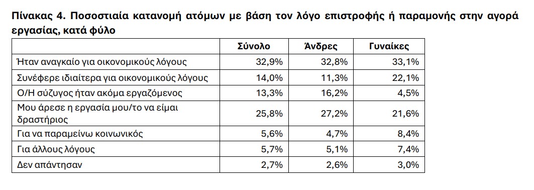 Ο κύριος λόγος επιστροφής ή παραμονής στην αγορά εργασίας, των ατόμων ηλικίας 50-74 ετών που λαμβάνουν σύνταξη γήρατος, ήταν οικονομικός – είτε επειδή υπήρχε ανάγκη (32,9%) είτε επειδή συνέφερε οικονομικά (14,0%). Τα στοιχεία παρουσιάζονται στον Πίνακα 4, από τον οποίο προκύπτει ότι, στις περισσότερες περιπτώσεις, τα ποσοστά ανδρών και γυναικών είναι παρόμοια.