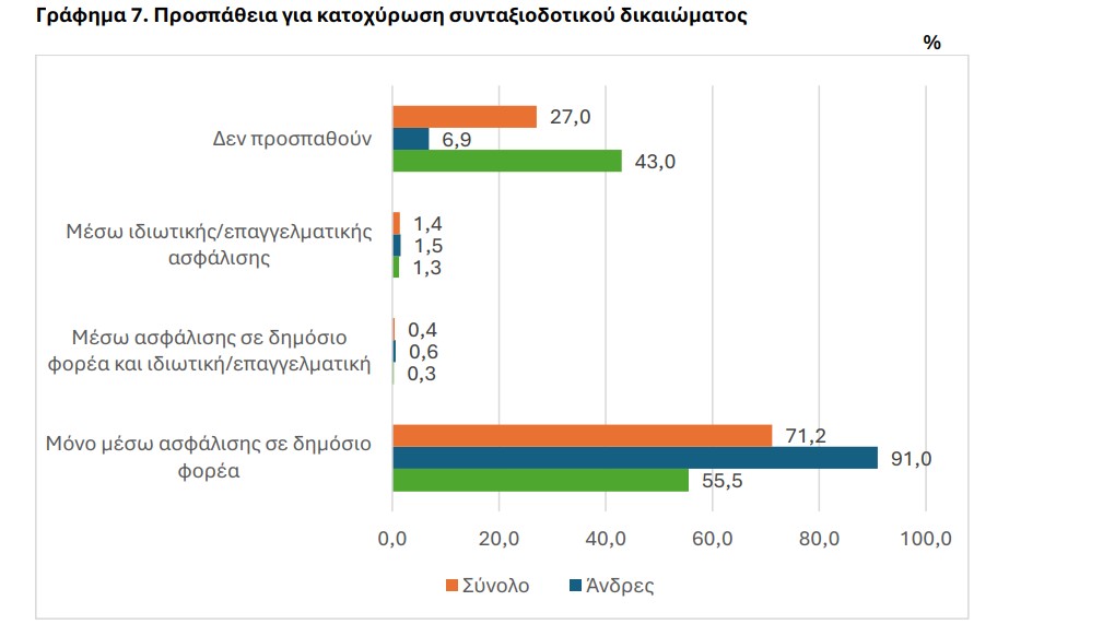 Από τα στοιχεία της έρευνας προκύπτει ότι τα άτομα ηλικίας 50-74 ετών που δεν λαμβάνουν ούτε σύνταξη γήρατος ούτε επαγγελματική σύνταξη, παρουσιάζουν σημαντικές διαφορές μεταξύ ανδρών και γυναικών σε ό,τι αφορά την προσπάθεια κατοχύρωσης συνταξιοδοτικού δικαιώματος. Η πλειονότητα (91,0%) των ανδρών προσπαθεί να κατοχυρώσει δικαίωμα σύνταξης – κυρίως, μέσω ασφάλισης σε δημόσιο φορέα.