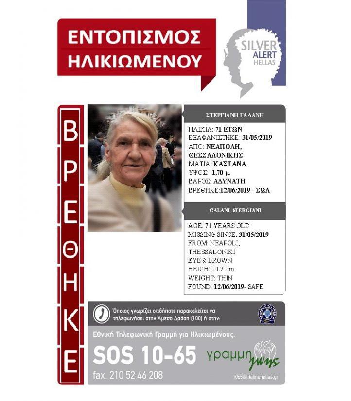 Η Κοινωνική Υπηρεσία του Εθελοντικού Οργανισμού δέχθηκε, την Τετάρτη, 12/06/2019 κλήση για την ανεύρεσή της. Η ηλικιωμένη εντοπίσθηκε περιπλανώμενη, από εθελοντές της Ομάδας Έρευνας και Διάσωσης, συνεργάτες του SILVER ALERT. Η κα Στεργιανή, είναι καλά στην υγεία της.