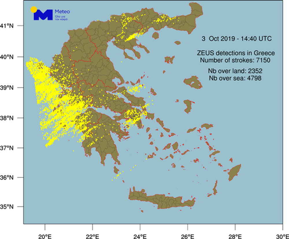 Παράλληλα, ισχυρές βροχές και καταιγίδες έπληξαν κυρίως τη Δυτική Ελλάδα και δευτερευόντως τη Μακεδονία και τα υπόλοιπα της Στερεάς Ελλάδας και της Πελοποννήσου. Το σύστημα «ΖΕΥΣ» κατέγραψε περί τους 7.000 κεραυνούς πάνω από την Ελληνική επικράτεια με 2.300 από αυτούς να εντοπίζονται πάνω από την ξηρά. Στην εικόνα που ακολουθεί παρουσιάζεται η γεωγραφική τους κατανομή.