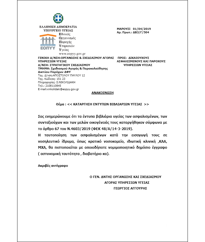 Την οριστική κατάργηση των έντυπων βιβλιαρίων υγείας των ασφαλισμένων, των συνταξιούχων και των μελών της οικογένειάς τους τους ανακοίνωσε ο ΕΟΠΥΥ, σύμφωνα με το άρθρο 67 του Ν.4603/2019 (ΦΕΚ 48/Α/14-3-2019).