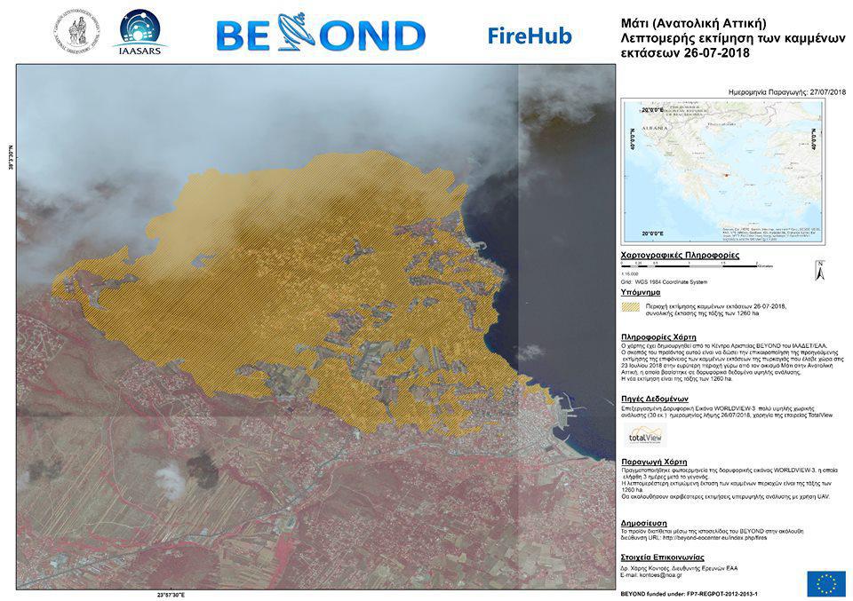Το ΕΑΑ παράλληλα δημοσίευσε έναν επικαιροποιημένο χάρτη με λεπτομερή εκτίμηση των ζημιών στην Ανατολική Αττική, κάνοντας χρήση δορυφορικής τηλεπισκόπησης. Σύμφωνα με το ΕΑΑ, η εκτιμώμενη έκταση των καμένων είναι της τάξης των 1.260 εκταρίων (12.600 στρεμμάτων). Η εκτίμηση αυτή έγινε κατόπιν επεξεργασίας της δορυφορικής εικόνας Worldview-3 πολύ υψηλής χωρικής ανάλυσης (30 εκ.), η οποία ελήφθη τρεις ημέρες μετά το γεγονός.