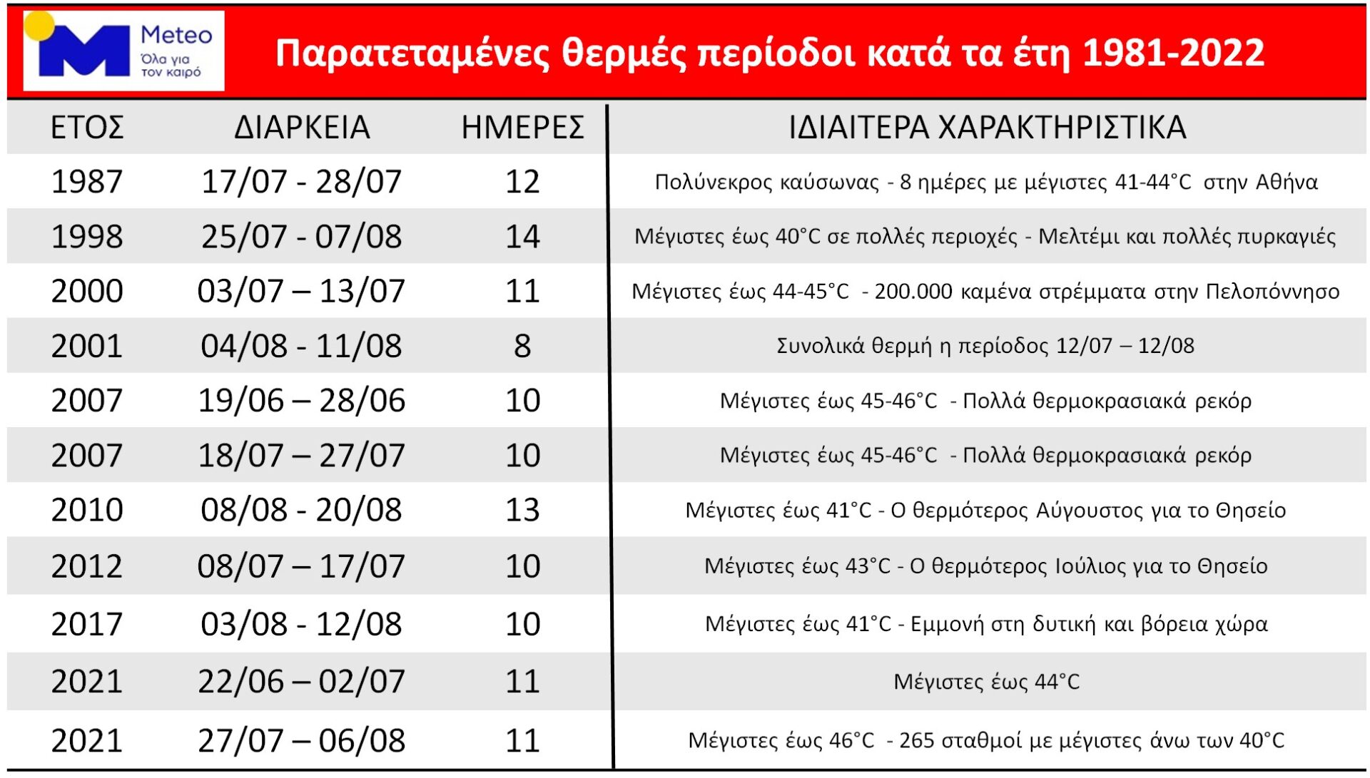 Με αφορμή το επερχόμενο παρατεταμένο θερμό κύμα, το meteo.gr καύσωνες με μεγάλη διάρκεια που εκδηλώθηκαν την περίοδο 1981-2022. Σε αυτούς έχουμε συμπεριλάβει και τους 2 μεγάλους καύσωνες του 2021 οι οποίοι είχαν διάρκεια 11 ημερών. Σημειώνεται ότι την ίδια περίοδο εκδηλώθηκαν και άλλοι καύσωνες ή έντονα θερμά επεισόδια, ωστόσο η επιλογή έγινε αποκλειστικά με κριτήριο τη διάρκεια του φαινομένου.