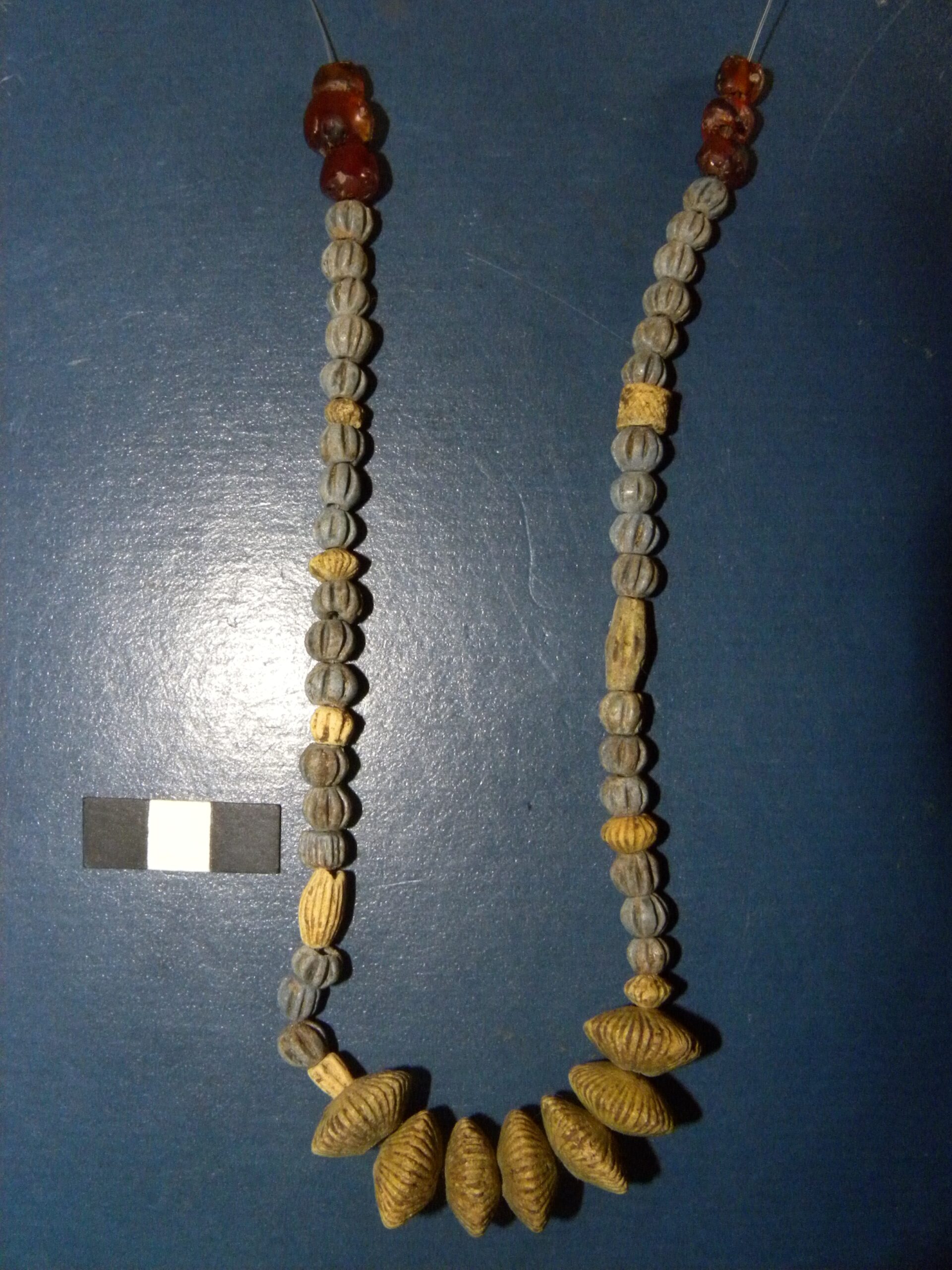 Βρέθηκε θαμμένο φορώντας ένα περίτεχνο περιδέραιο φτιαγμένο από 93 χάντρες από φαγεντιανή και υαλόμαζα, καθώς και έξι από κορναλίνη, εύρημα δηλωτικό της φροντίδας που έλαβε στη ζωή και στον θάνατό του.