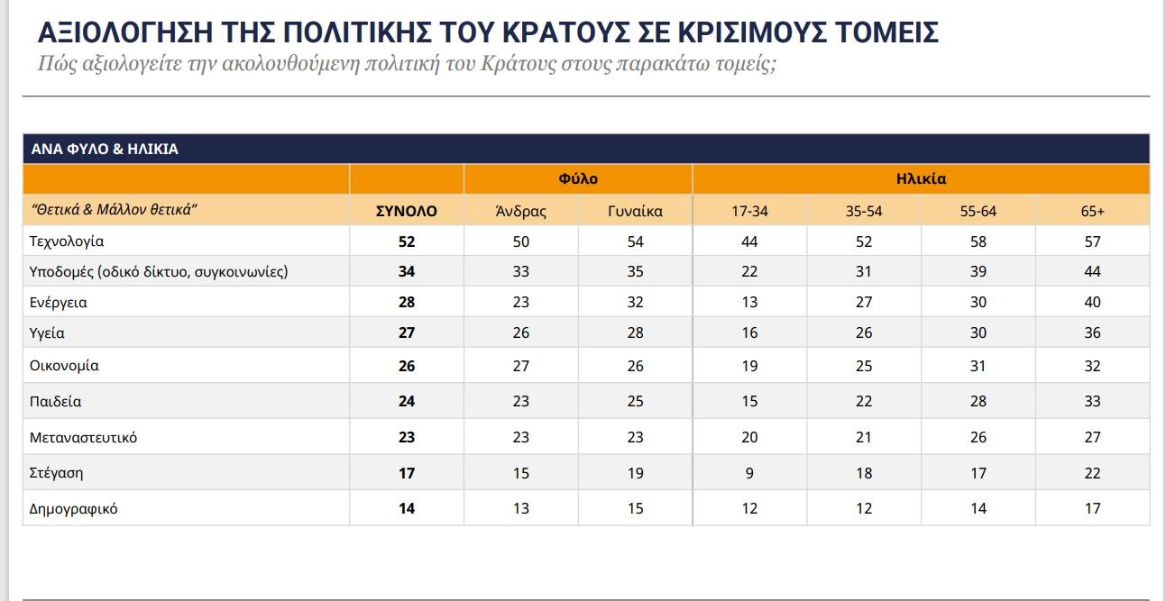 Οι πολίτες αξιολογούν αρνητικά την κρατική πολιτική σε δημογραφικό, στέγαση, παιδεία, οικονομία, υγεία, ενέργεια, αξιοκρατία με ποσοστά που αγγίζουν ως και το 83%.