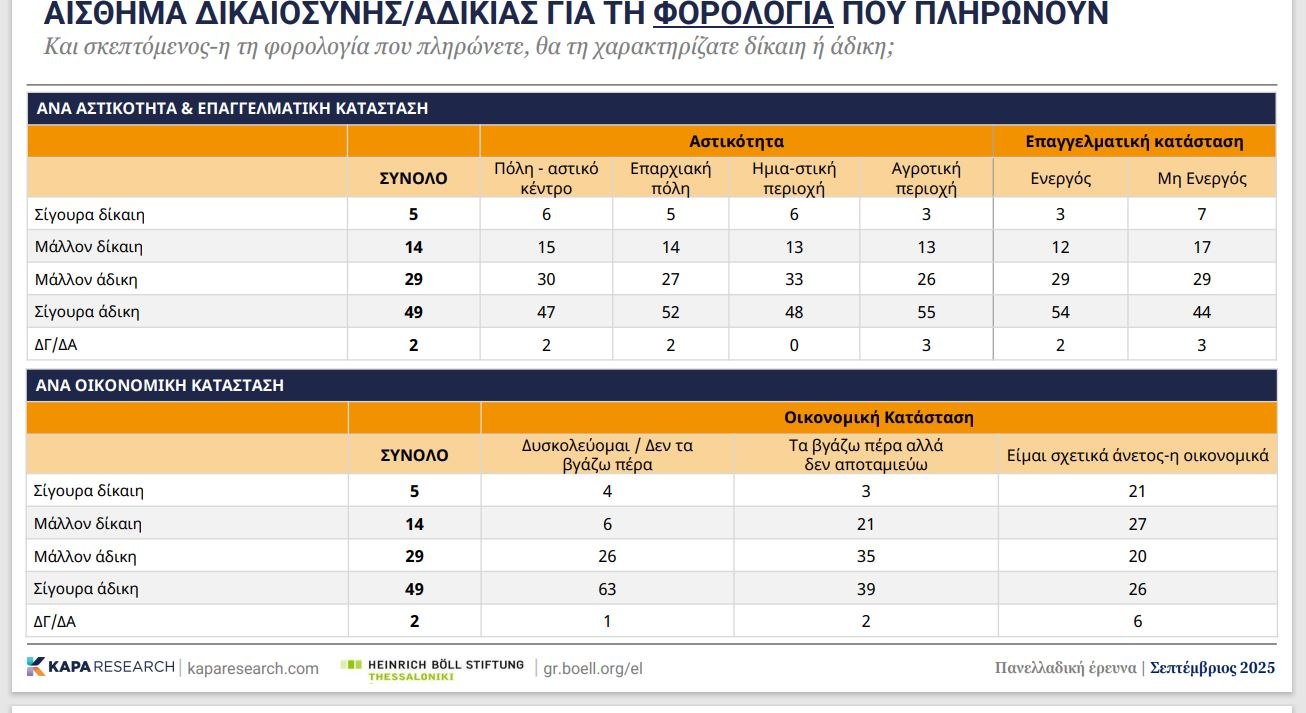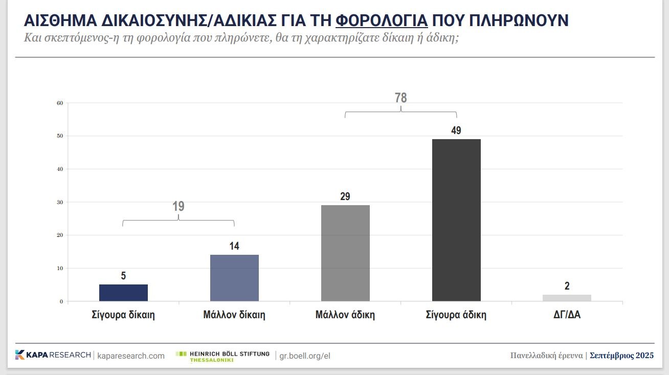 Το «αίσθημα αδικίας στην ελληνική κοινωνία», ένας παράγοντας που εξετάζει η έρευνα, είναι ιδιαίτερα έντονο στο θέμα της φορολογίας. Σχεδόν οχτώ στους δέκα πολίτες θεωρούν άδικη τη φορολογία που πληρώνουν. Το αίσθημα φορολογικής αδικίας είναι πιο έντονο στους οικονομικά ασθενέστερους, και αγγίζει το 90%, στους εργάτες, τους αγρότες και τους μικρομεσαίους.
