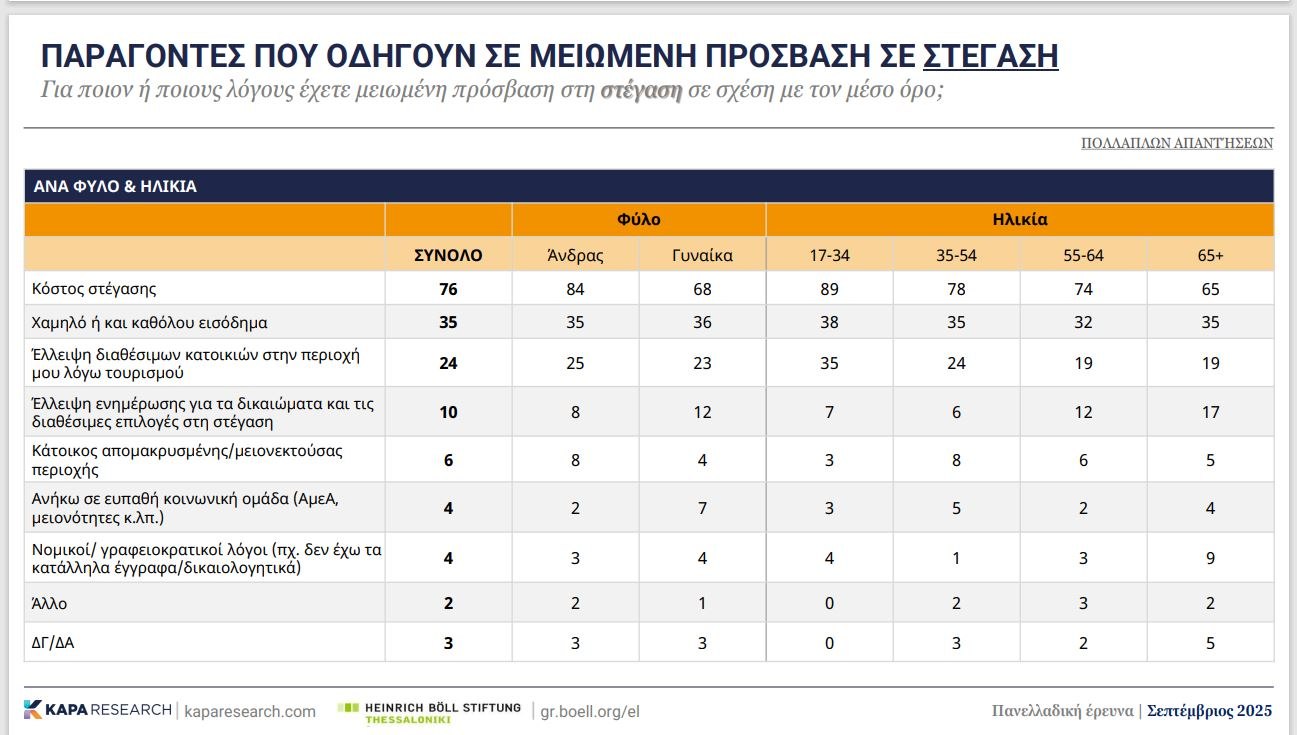 O κ. Γούδης μας υπενθυμίζει ότι η Ελλάδα είναι μακράν η χώρα με το υψηλότερο ποσοστό πληθυσμού που πληρώνει πάνω από το 40% του εισοδήματός του για στέγαση. Δεν πρόκειται για ένα πρόσκαιρο εύρημα, αλλά επιβεβαιώνεται τα τελευταία δέκα χρόνια. Ταυτόχρονα, έχει ένα από τα υψηλότερα ποσοστά ενεργειακής φτώχειας.