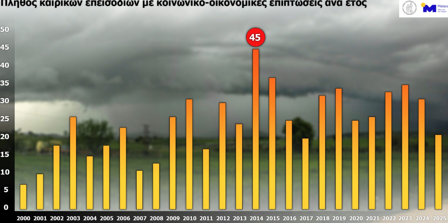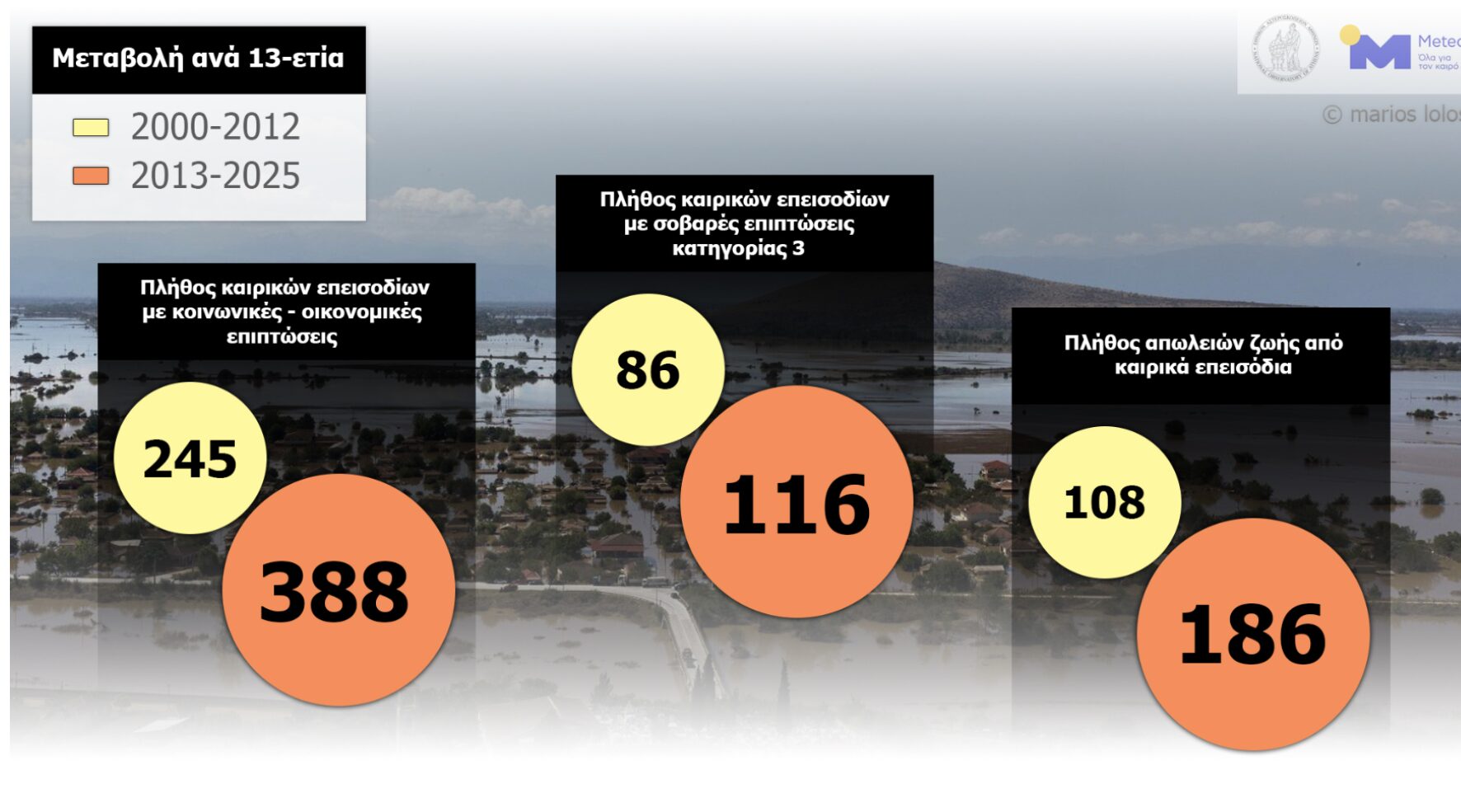 Ραγδαία αύξηση στα καιρικά φαινόμενα με αρνητικές κοινωνικοοικονομικές επιπτώσεις και στους θανάτους αποτυπώνεται σε στοιχεία που δημοσίευσε το Meteo. Όπως προκύπτει, τα τελευταία 13 χρόνια, οι επιπτώσεις από ισχυρής, αλλά ακόμη και μικρής έντασης κακοκαιρίες, ολοένα και αυξάνεται. Πρόκειται για γεγονός που αναδεικνύει με τον πλέον έντονο τρόπο, ότι ειδικά στα μεγάλα αστικά κέντρα, η υπερδόμηση, τα ανολοκλήρωτα αντιπλημμυρικά έργα και η ανεπαρκής πρόληψη, οδηγούν σε επαναλαμβανόμενες καταστροφές.